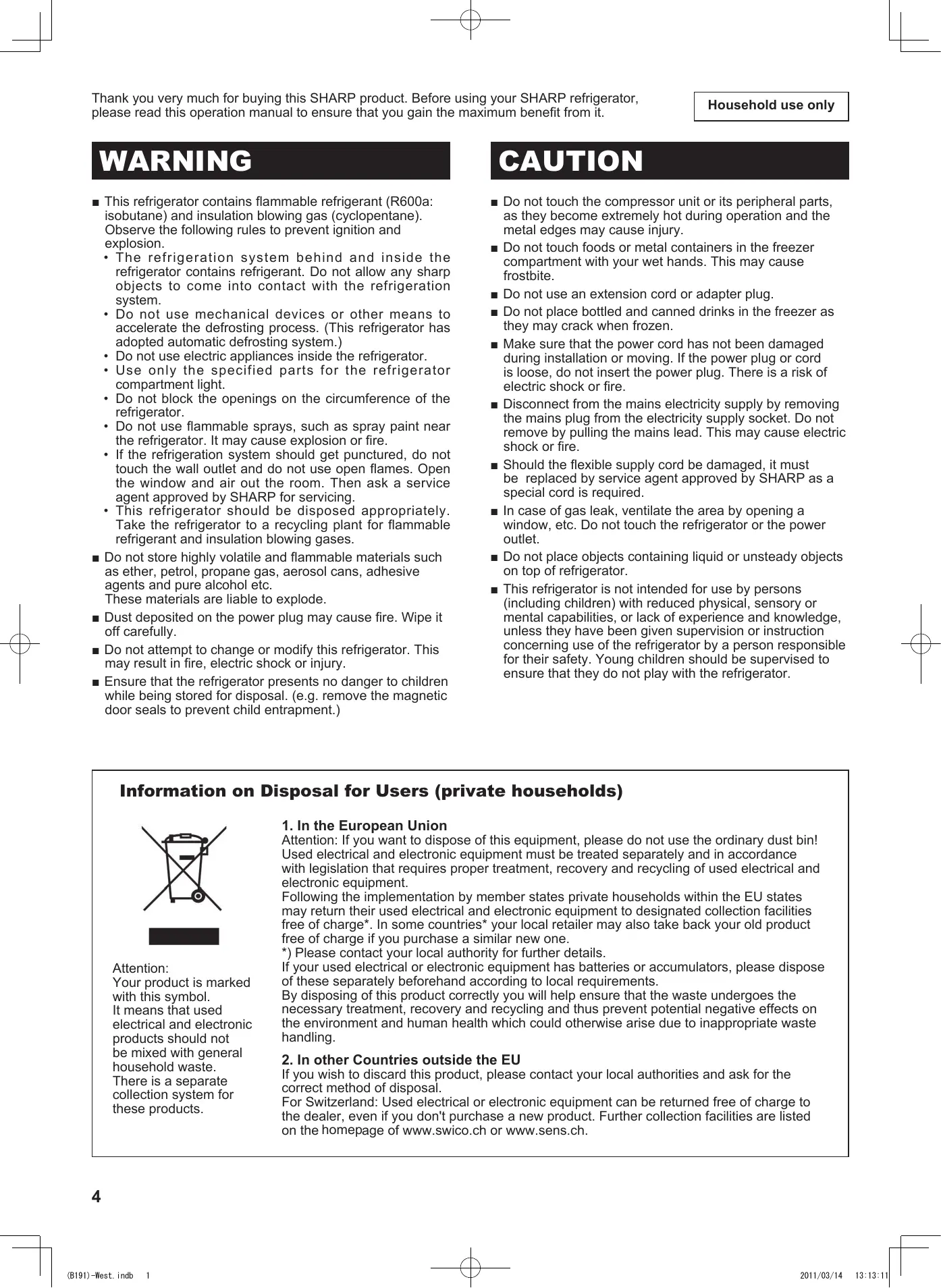 • La comida debe ser fresca. • Congele la comida en porciones pequeñas para congelarla más rápido. Los alimentos en el compartimiento • ¿El frigorífico ha estado trabajando por mucho tiempo con el control de temp. del frigorífico se congelan. establecido en MAX? • Una temperatura ambiente baja puede hacer que la comida se congele aunque tenga el control de temperatura del frigorífico ajustado a MIN. Existen olores en el compartimiento. • Se deben envolver los alimentos con olores fuertes. • La unidad de desodorización no puede eliminar todos los olores. La alarma de la puerta no se • Si no se suspende la alarma de la puerta después de cerrarla, es un defecto. Póngase suspende. en contacto con el centro de servicio de Sharp para solucionar el problema. Método para suspender la alarma de la puerta temporalmente . Ajuste al mismo tiempo los botones para el control de temp. de acuerdo a los pasos siguientes. 3 3 • Le système de réfrigération à l’arrière et à l’intérieur de l’appareil renferme un produit réfrigérant. Veillez à ce qu’aucun objet pointu n’entre en contact avec le système de réfrigération. • Ne pas utiliser d'appareils mécaniques ou d'autre moyen pour accélérer le processus de dégivrage. (Ce réfrigérateur dispose d'un systéme de dégivrage automatique.) • N’utilisez pas d’appareils électriques à l’intérieur du réfrigérateur. • Utiliser uniquement les pièces destinées à la lampe du compartiment du réfrigérateur. • Ne bloquez pas les ouvertures autour du réfrigérateur. • N’utilisez pas de sprays inflammables tels que des bombes de peinture près du réfrigérateur. Ceci peut causer une explosion ou un incendie. • Si le système de réfrigération devait être percé, ne touchez pas la prise murale et n’exposez pas le réfrigérateur à des flammes nues. Ouvrez la fenêtre et aérez la pièce. Puis sollicitez le dépannage auprès d’un agent de service agréé SHARP. • Ce réfrigérateur doit être mis au rebut correctement. Apportez ce réfrigérateur dans un centre de recyclage pour produits réfrigérants inflammables et gaz soufflants isolants. ■ Ne rangez pas de matériaux hautement volatiles et inflammables, comme de l’éther, de l’essence, du gaz propane, des bombes aérosols, des agents adhésifs et de l’alcool pur, etc. Ces matériaux sont susceptibles d’exploser. ■ Ne pas laisser s'accumuler la poussière sur la prise électrique. Ceci peut être à l'origine d'incendie. L’essuyer soigneusement. ■ N'effectuez aucune modification vous-même sur le réfrigérateur. Ceci peut être la cause d’électrocutions, incendies ou blessures. Seuls des techniciens de réparation qualifiés sont habilités à démonter ou réparer le réfrigérateur. ■ Assurez-vous que le réfrigérateur stocké pour être mis au rebut ne présente pas un danger pour les enfants. (Par exemple enlevez le joint de porte magnétique pour empêcher les enfants ne se piègent avec.)
