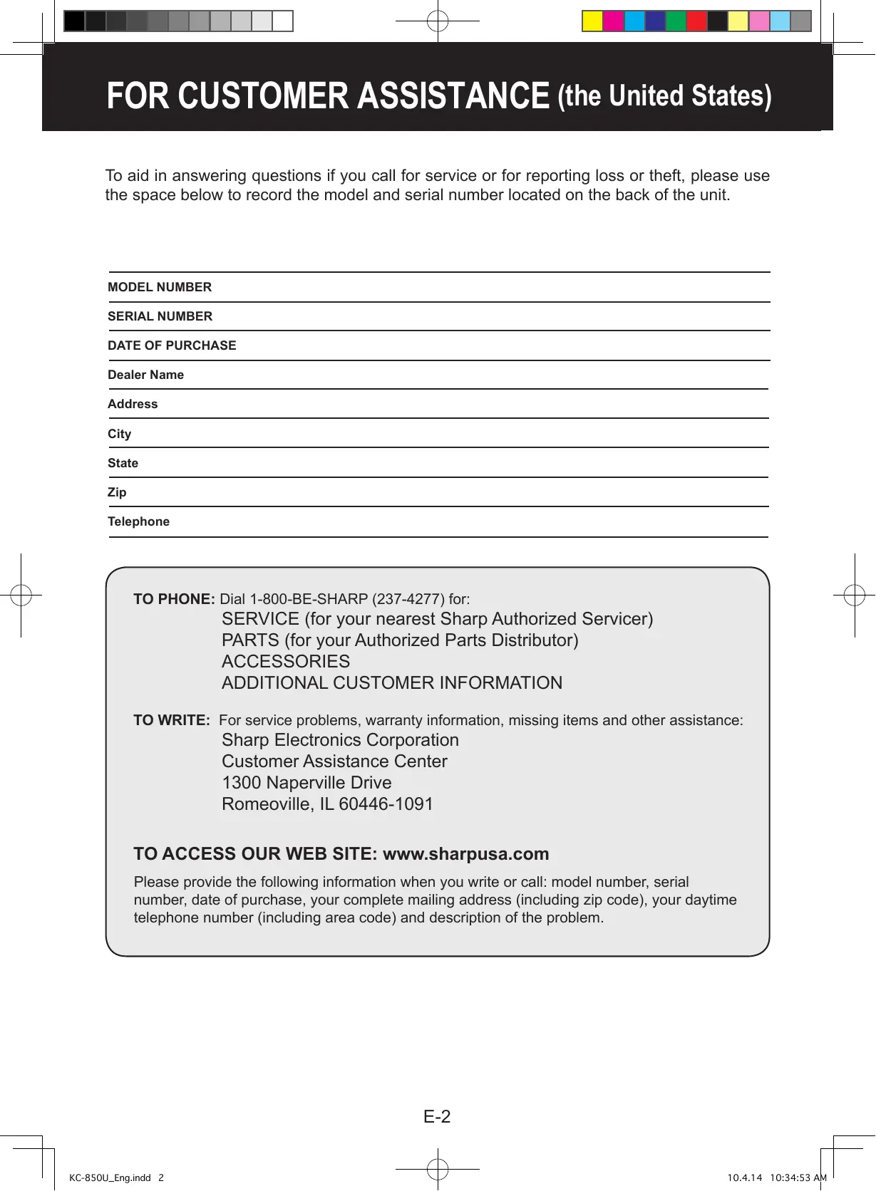 TO ACCESS OUR WEB SITE: www.sharpusa.com Please provide the following information when you write or call: model number, serial number, date of purchase, your complete mailing address (including zip code), your daytime telephone number (including area code) and description of the problem.