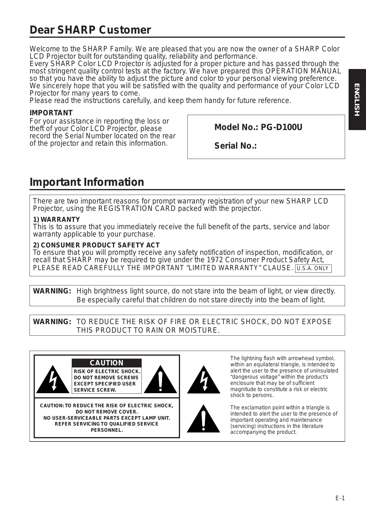 Dear SHARP Customer Welcome to the SHARP Family. We are pleased that you are now the owner of a SHARP Color LCD Projector built for outstanding quality, reliability and performance. Every SHARP Color LCD Projector is adjusted for a proper picture and has passed through the most stringent quality control tests at the factory. We have prepared this OPERATION MANUAL so that you have the ability to adjust the picture and color to your personal viewing preference. We sincerely hope that you will be satisfied with the quality and performance of your Color LCD Projector for many years to come. Please read the instructions carefully, and keep them handy for future reference. IMPORTANT For your assistance in reporting the loss or theft of your Color LCD Projector, please Model No.: PG-D100U record the Serial Number located on the rear of the projector and retain this information. Serial No.: Important Information There are two important reasons for prompt warranty registration of your new SHARP LCD Projector, using the REGISTRATION CARD packed with the projector.