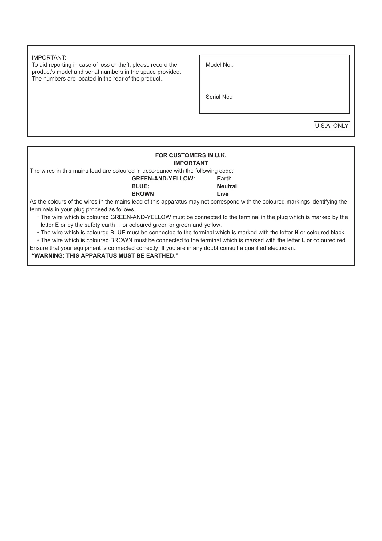 As the colours of the wires in the mains lead of this apparatus may not correspond with the coloured markings identifying the terminals in your plug proceed as follows: + The wire which is coloured GREEN-AND-YELLOW must be connected to the terminal in the plug which is marked by the letter E or by the safety earth L or coloured green or green-and-yellow. - The wire which is coloured BLUE must be connected to the terminal which is marked with the letter N or coloured black. + The wire which is coloured BROWN must be connected to the terminal which is marked with the letter L or coloured red. Ensure that your equipment is connected correctly. If you are in any doubt consult a qualified electrician. “WARNING: THIS APPARATUS MUST BE EARTHED.”