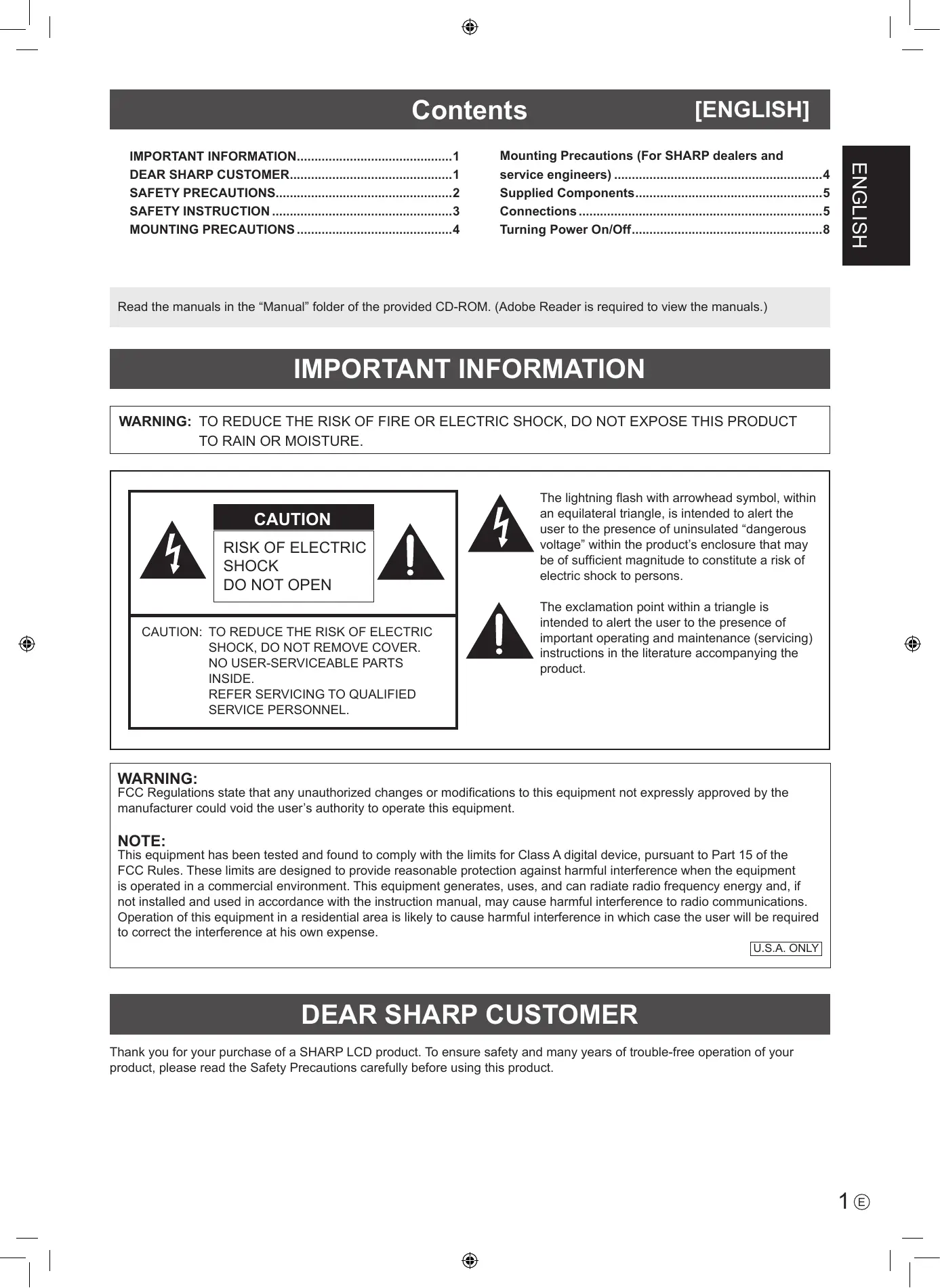U.S.A. ONLY DEAR SHARP CUSTOMER Thank you for your purchase of a SHARP LCD product. To ensure safety and many years of trouble-free operation of your product, please read the Safety Precautions carefully before using this product.