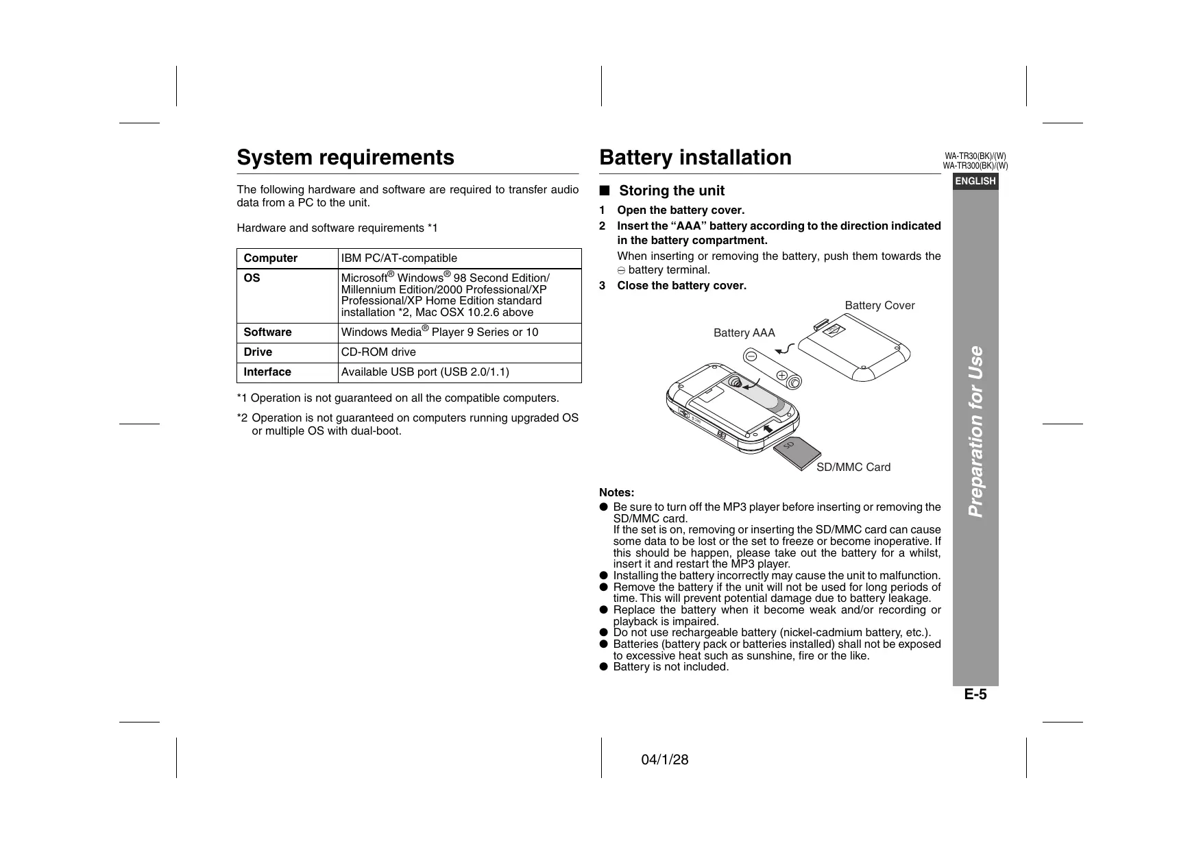 B Preparation for Use Battery installation . SD/MMC card installa Turning the unit on/off . Hold function . : Changing the display languagi Connecting the unit to a PC & Windows Media Player Ripping tracks from audio CD to PC . Transferring audio data from PC to the unit. B Playback Disconnecting the unit Playing transferred audio data Advanced playback . Playing selected data