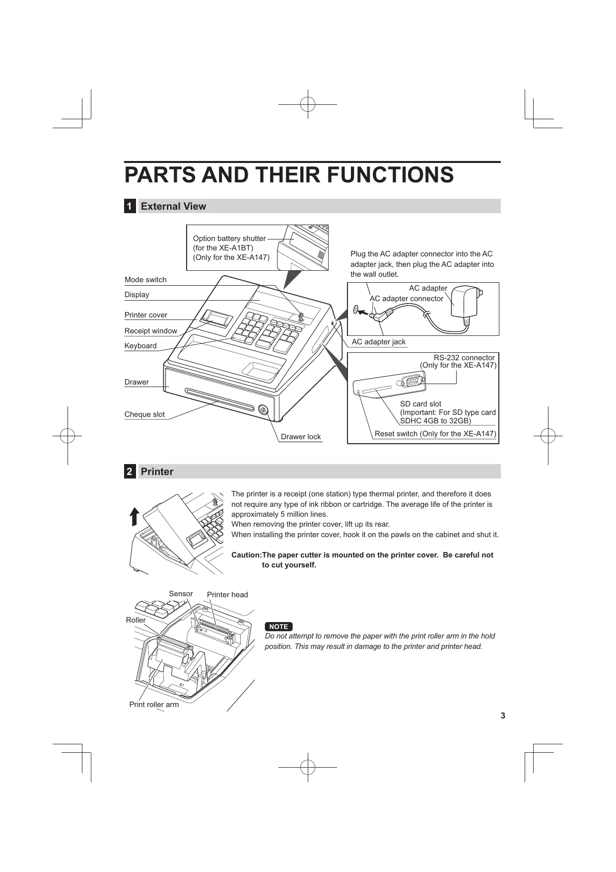 [1 | External View Option battery shutter (for the XE-ABT) . (Oniy forthe XE-A147) IT Plug the AC adapter connector into the AC FR adapter jack, then plug the AC adapter into ï the wall outlet Mode switch AC adapter AC adapter connector Printer cover Display 4 O. Receipt window AC adapter jack Keyboard RS-232 connector {Only for the XE-A147) Drawer SD card slot important: For SD type card SDHC 4GB to 32GB) Reset switch (Only for the XE-A147) Cheque slot Drawer lock The printer is a receipt (one station) type thermal printer, and therefore it does not require any type of ink ribbon or cartridge. The average life of the printer is approximately 5 million lines. When removing the printer cover, lift up its rear. When installing the printer cover, hock it on the pawls on the cabinet and shut it. Caution:The paper cutter is mounted on the printer cover. Be careful not to cut yourself. Sensor Printer head Do not attempt to remove the paper with the print roller arm in the hold position. This may result in damage to the printer and printer head. Print roller arm