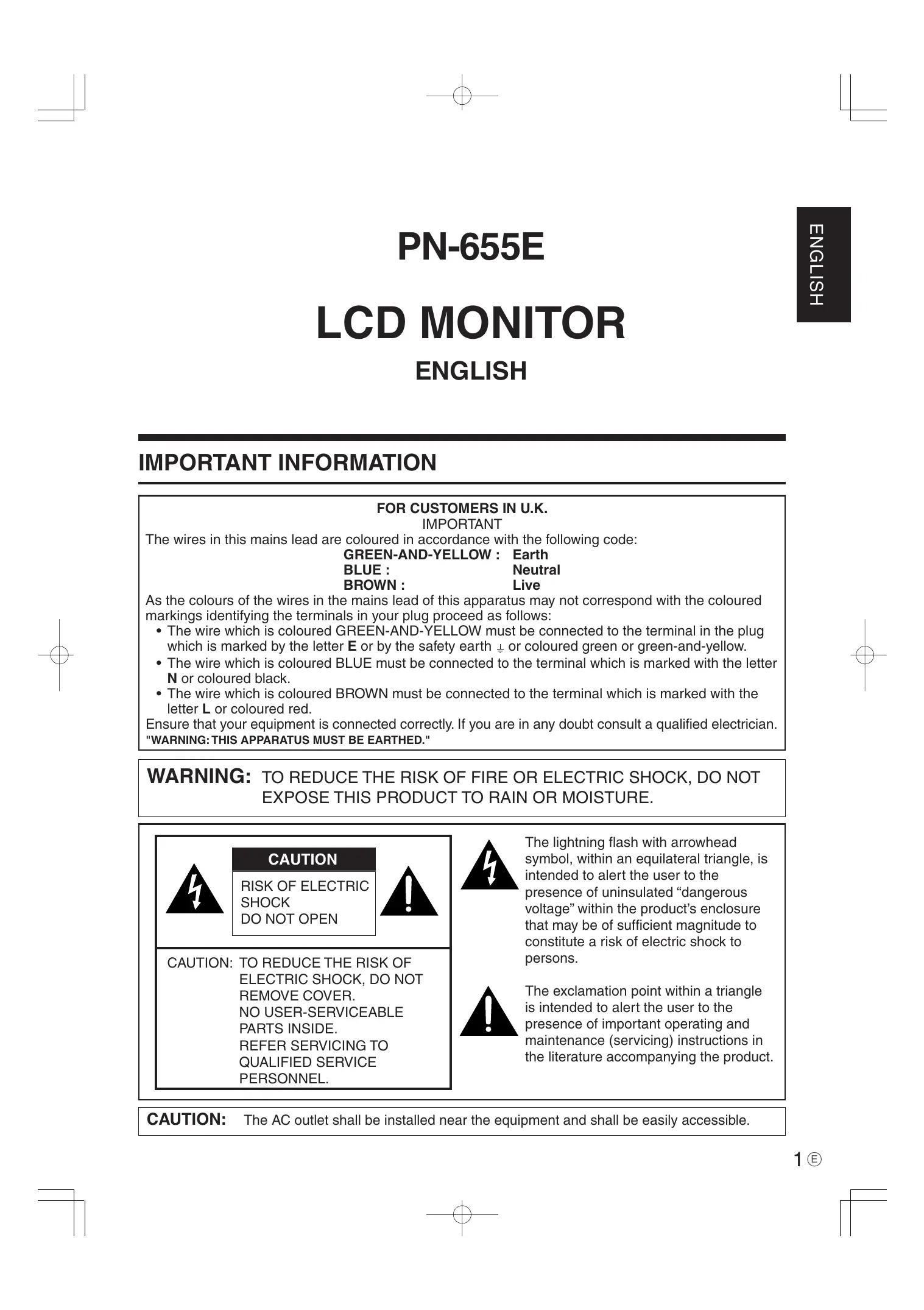 JA PN-655E LCD MONITOR ENGLISH IMPORTANT INFORMATION FOR CUSTOMERS IN U.K. IMPORTANT The wires in this mains lead are coloured in accordance with the following code: GREEN-AND-YELLOW : Earth BLUE : Neutral BROWN : Live As the colours of the wires in the mains lead of this apparatus may not correspond with the coloured markings identifying the terminals in your plug proceed as follows: + The wire which is coloured GREEN-AND-YELLOW must be connected to the terminal in the plug which is marked by the letter E or by the safety earth 1 or coloured green or green-and-yellow. + The wire which is coloured BLUE must be connected to the terminal which is marked with the letter N or coloured black. + The wire which is coloured BROWN must be connected to the terminal which is marked with the letter L or coloured red. Ensure that your equipment is connected correctly. If you are in any doubt consult a qualified electrician. "WARNING: THIS APPARATUS MUST BE EARTHED."