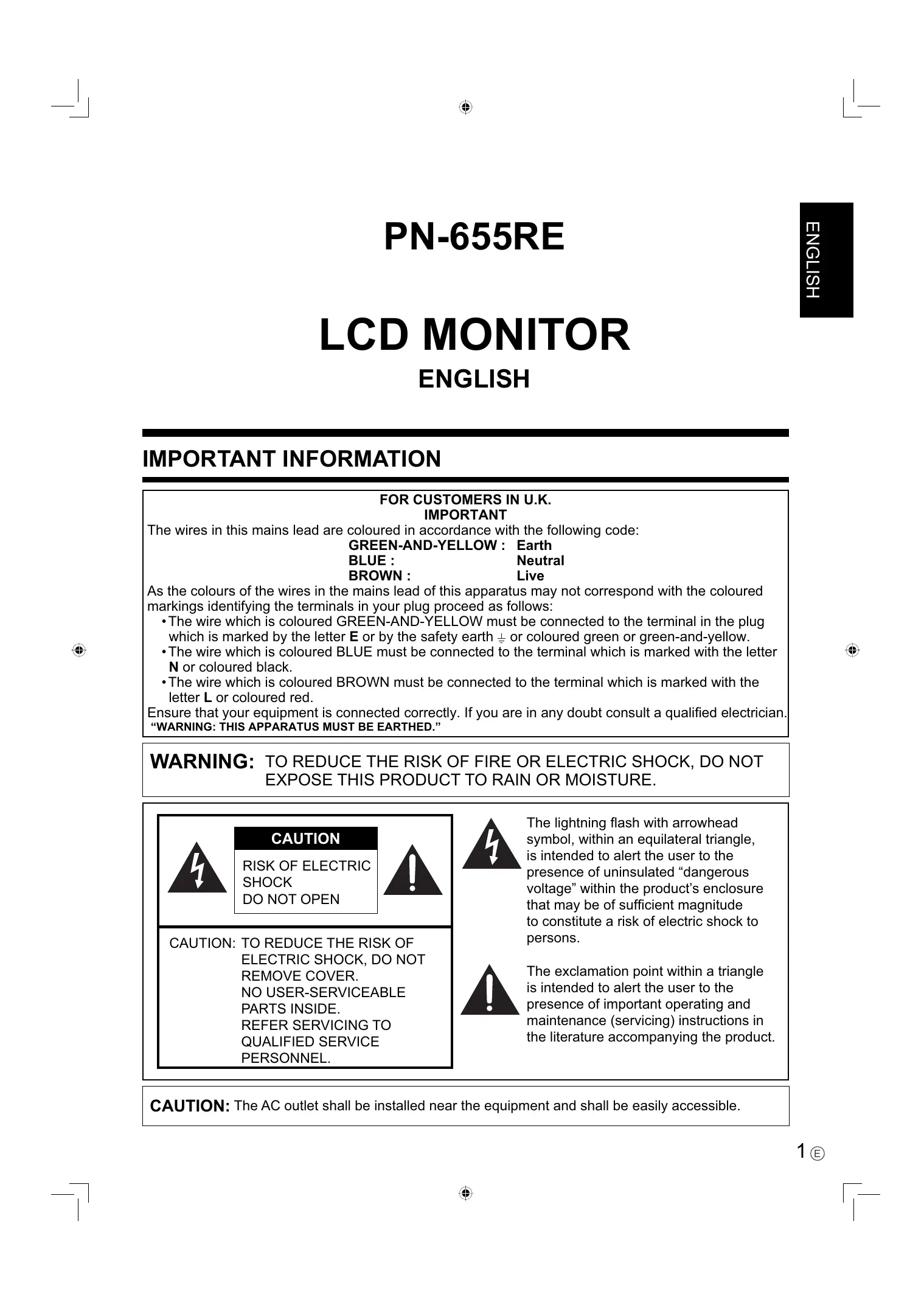 ENGLISH PN-655RE LCD MONITOR ENGLISH IMPORTANT INFORMATION FOR CUSTOMERS IN U.K. IMPORTANT The wires in this mains lead are coloured in accordance with the following code: GREEN-AND-YELLOW : Earth BLUE : Neutral BROWN : Live As the colours of the wires in the mains lead of this apparatus may not correspond with the coloured markings identifying the terminals in your plug proceed as follows: • The wire which is coloured GREEN-AND-YELLOW must be connected to the terminal in the plug which is marked by the letter E or by the safety earth or coloured green or green-and-yellow. • The wire which is coloured BLUE must be connected to the terminal which is marked with the letter N or coloured black. • The wire which is coloured BROWN must be connected to the terminal which is marked with the letter L or coloured red. Ensure that your equipment is connected correctly. If you are in any doubt consult a qualified electrician. “WARNING: THIS APPARATUS MUST BE EARTHED.”