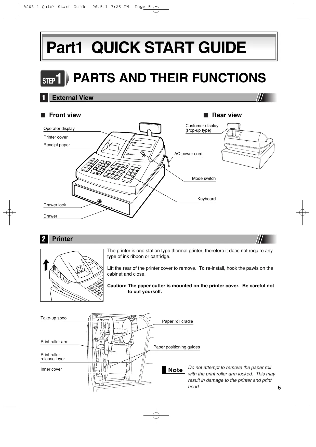 The printer is one station type thermal printer, therefore it does not require any type of ink ribbon or cartridge. Lift the rear of the printer cover to remove. To re-install, hook the pawls on the cabinet and close. Caution: The paper cutter is mounted on the printer cover. Be careful not to cut yourself.