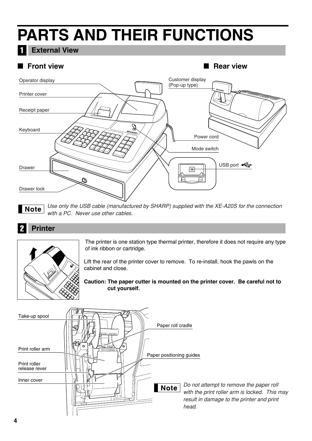 ü External View H Front view H Rear view Customer display Operator display Gustomer dis op-up type) Printer cover Receipt paper Keyboard Power cord Mode switch Drawer Drawer lock Use only the USB cable (manufactured by SHARP) supplied with the XE-A20S for the connection with a PC. Never use other cables. A brinier The printer is one station type thermal printer, therefore it does not require any type of ink ribbon or cartridge. Lift the rear of the printer cover to remove. To re-install, hook the pawis on the cabinet and close. Caution: The paper cutter is mounted on the printer cover. Be careful not to cut yourself. Take-up spool Print roller arm Print roller release rever Inner cover Do not attempt to remove the paper roll with the print roller arm is locked. This may result in damage to the printer and print head.