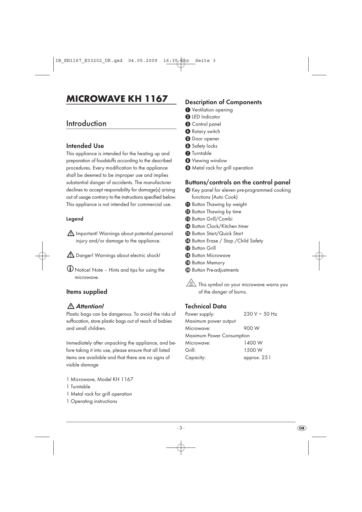 IB_KH1167 E33202 UK.qxd 04.05.2009 1: = Seite 5 Verify the programme once more after starting the microwave oven. UNDER NO CIRCUMSTANCES should you remove the microwave oven housing. NEVER pour fluids into the ventilation openings or the safety locks. Should fluids ever enter them, IMMEDIATELY switch the microwave oven off and remove the plug from the power socket. Arrange for the appliance to be checked by qualified specialists. NEVER insert foreign objects into the ventilation openings or the safety locks. Should the lamp in the interior of the microwave oven need replacing, arrange for this to be done by a qualified specialist. Proceed with caution when warming up fluids. Use only open containers, so that any air bubbles produced can escape. To avoid sudden simmering: - Stir the fluid before warming it up. - IF possible, place a glass rod in the fluid for as long as it is being heated. - To avoid an unexpected reboiling, leave the fluid to stand in the microwave oven for approx. 20 seconds after being warmed up. Puncture the skins of potatoes, sausages or similar. Otherwise, they could burst. Keep children well away from the microwave oven when it is in use. Risk of Burns! NEVER touch the microwave oven door, housing, ventilation openings, accessories or the dinner- ware directly after the grill, combi or automatic menu process. The parts will be very hot. Allow them to cool down before cleaning them. Do not lean on the microwave oven door. Do not use the microwave oven as a toy. Do not modify the microwave oven. Do not transport the microwave oven when it is in use. Do not exceed the cooking times detailed by the manufacturer. Do not use metallic utensils which reflect micro- waves and lead to sparking. Do not place tin- cans into the microwave. Operate the microwave oven only when the turn- table is in its position. Do not place any objects on the microwave oven when it is in use. Do not place plastic containers in the microwave oven immediately after a grill, combi or automatic menu process. The plastic could melt. Drops of water can form on the microwave oven door or on the housing. This is normal and is not an indication of a malfunction. Ensure that the plug is at all times easily accessible, so that it can be quickly removed in the event of an emergency. Do not place the microwave oven adjacent to other appliances discharging heat, for example, an oven. Clean the microwave oven thoroughly after warming up greasy foods, especially ifthey were not covered. Allow the appliance to cool down completely before cleaning it. Residues such as fat or grease cannot be allowed to collect on the heating elements of the grill. They could possibly ignite. Do not thaw frozen fat or oil in the microwave oven. The fat or oil could ignite. People fited with a heart pacemaker should consult their doctor about the possible risks of using a microwave oven before taking one into use. NEVER submerse the appliance, the power cable or the plug in water or other fluids.
