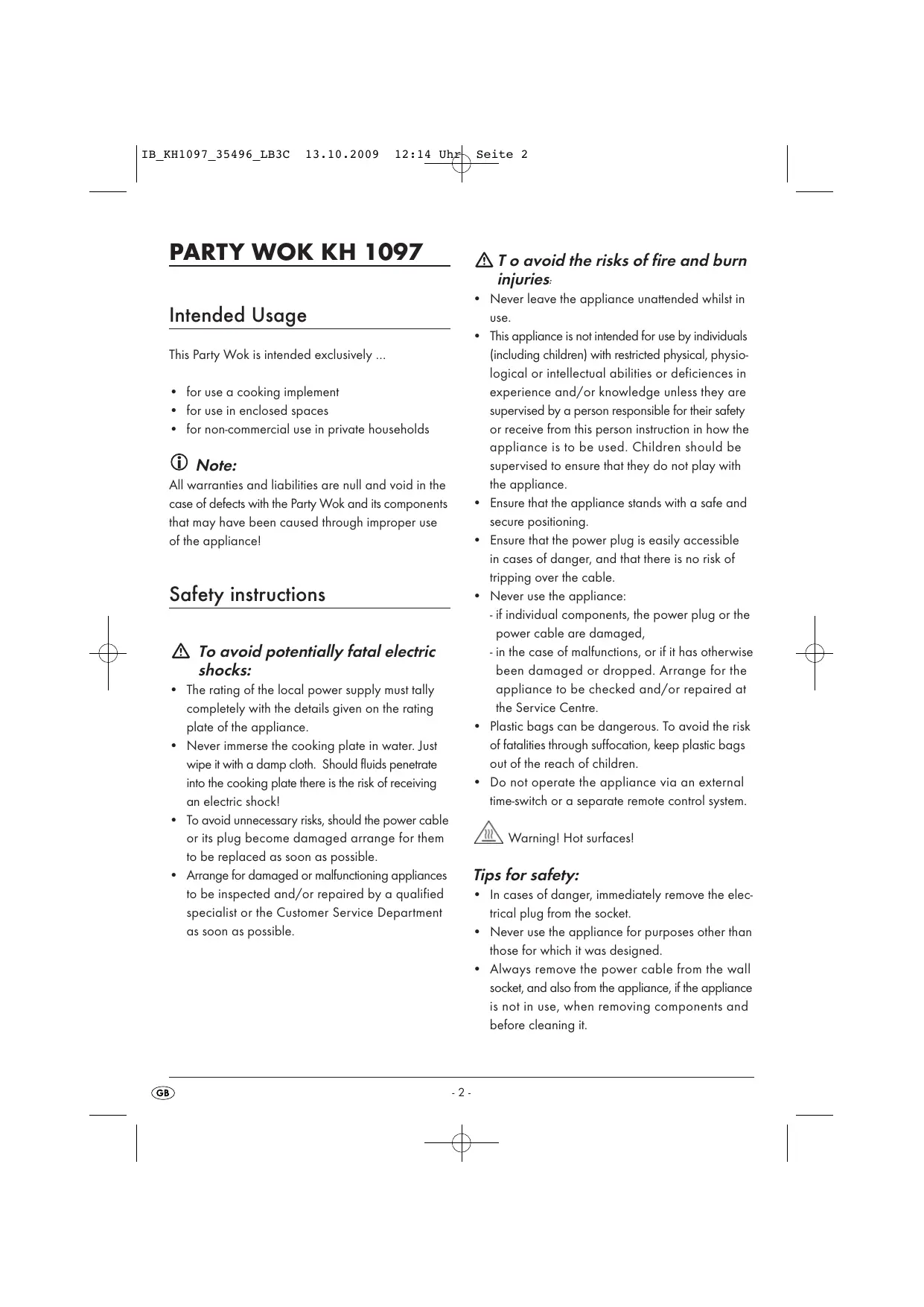 Intended Usage This Party Wok is intended exclusively … + for use a cooking implement +_ for use in enclosed spaces +_ for non-commercial use in private households © Note: All warranties and liabilities are null and void in the case of defects with the Party Wok and its components that may have been caused through improper use ofthe appliancel Safety instructions À To avoid potentially fatal electric shocks: The rating of the local power supply must tally completely with the details given on the rating plate of the appliance. + Never immerse the cooking plate in water. Just wipe it with a damp cloth. Should fluids penetrate into the cooking plate there is the risk of receiving an electric shockl + To avoid unnecessary risks, should the power cable or its plug become damaged arrange for them to be replaced as soon as possible. + Arrange for damaged or malfunclioning appliances to be inspected and/or repaired by a qualified specialist or the Customer Service Department as soon as possible. 4 me Seite 2 ÂTo avoid the risks of fire and burn injures. Never leave the appliance unattended whilst in use. This appliance is not intended for use by individuals {including children) with restricted physical, physio- logical or intellectual abilities or deficiences in experience and/or knowledge unless they are supervised by a person responsible for their safety or receive from this person instruction in how the appliance is to be used. Children should be supervised to ensure that they do not play with the appliance. Ensure that the appliance stands with a safe and secure posifioning. Ensure that the power plug is easily accessible in cases of danger, and that there is no risk of tripping over the cable. Never use the appliance: -ifindividual components, the power plug or the power cable are damaged, - in the case of malfunctions, or if it has otherwise been damaged or dropped. Arrange for the appliance to be checked and/or repaired at the Service Centre. Plastic bags can be dangerous. To avoid the risk of fatalities through suffocation, keep plastic bags out of the reach of children. Do not operate the appliance via an external time-switch or a separate remote control system. AN Warning! Hot surfaces! Tips for safety: +_In cases of danger, immediately remove the elec: trical plug from the socket. Never use the appliance for purposes other than those for which it was designed. Always remove the power cable from the wall socket, and also from the appliance, ifihe appliance is not in use, when removing components and before cleaning it.