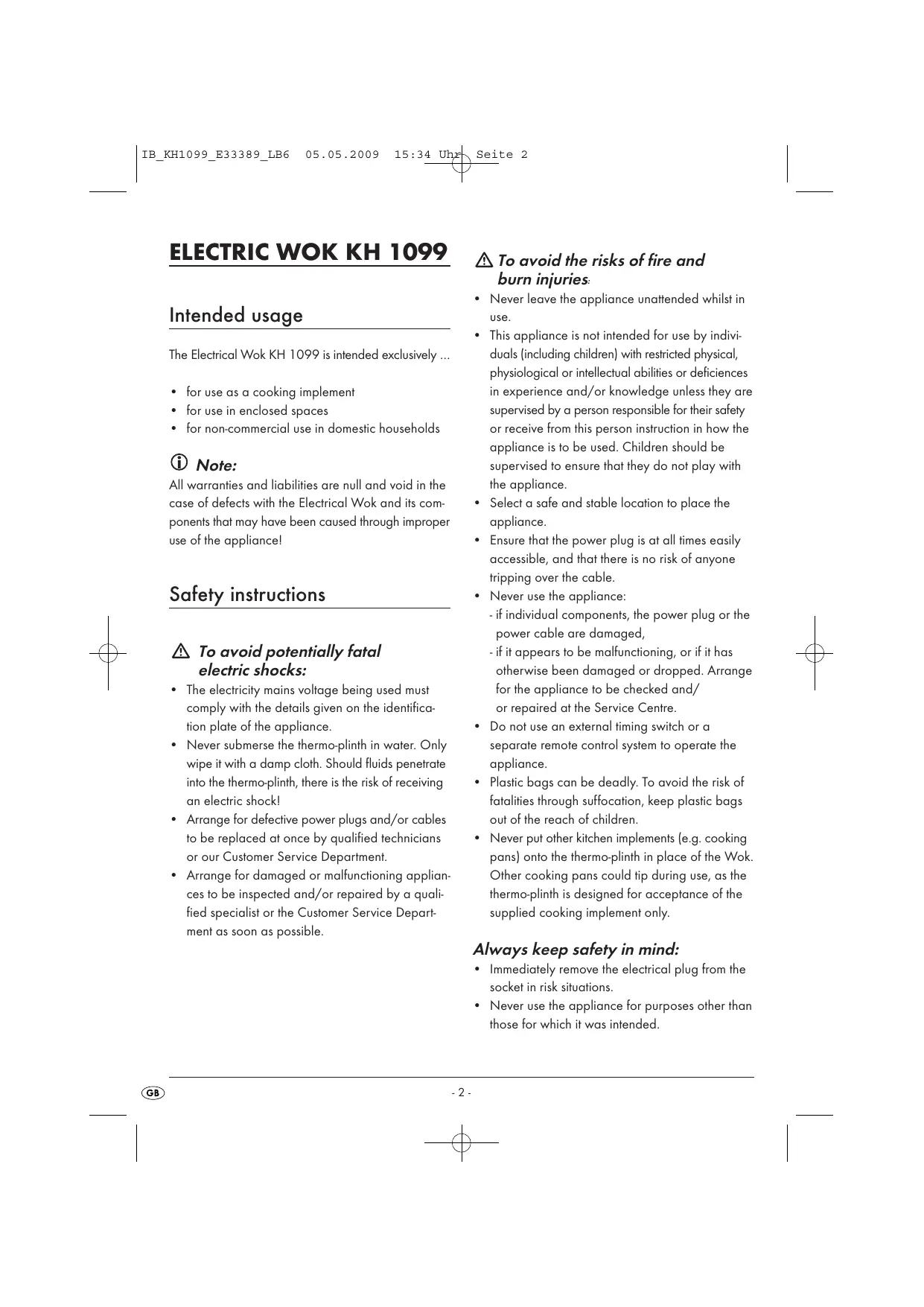 Intended usage The Electrical Wok KH 1099 is intended exclusively … +_ for use as a cooking implement +_ for use in enclosed spaces +_ for non-commercial use in domestic households © Note: All warranties and liabilities are null and void in the case of defects with the Electrical Wok and its com- ponents that may have been caused through improper use of the appliancel Safety instructions À To avoid potentially fatal electric shocks: + _The electricity mains voltage being used must comply with the details given on the identifica- tion plate of the appliance. +_Never submerse the thermo-plinth in water. Only wipe it with a damp cloth. Should fluids penetrate into the thermo-plinth, there is the risk of receiving an electric shock! Arrange for defective power plugs and/or cables to be replaced at once by qualified technicians or our Customer Service Department. +_ Arrange for damaged or malfunctioning applian- ces to be inspected and/or repaired by a quali- fied specialist or the Customer Service Depart- ment as soon as possible. 4 2e Seite 2 À To avoid the risks of fire and burn injuries: Never leave the appliance unattended whilst in use. This appliance is not intended for use by indivi- duals [including children] with restricted physical, physiological or intellectual abiltes or deficiences in experience and/or knowledge unless they are supervised by a person responsible for their safety or receive from this person instruction in how the appliance is to be used. Children should be supervised to ensure that they do not play with the appliance. Select a safe and stable location to place the appliance. Ensure that the power plug is at all times easily accessible, and that there is no risk of anyone tripping over the cable. Never use the appliance: - ifindividual components, the power plug or the power cable are damaged, - iFit appears to be malfunctioning, or if it has otherwise been damaged or dropped. Arrange for the appliance to be checked and/ or repaired at the Service Centre. Do not use an external timing switch or a separate remote control system to operate the appliance. Plastic bags can be deadly. To avoid the risk of fatalities through suffocation, keep plastic bags out of the reach of children. Never put other kitchen implements (e.g. cooking pans) onto the thermo-plinth in place of the Wok. Other cooking pans could tip during use, as the thermo-plinth is designed for acceptance of the supplied cooking implement only. Always keep safety in mind: +_Immediately remove the electrical plug from the socket in risk situations. + Never use the appliance for purposes other than those for which it was intended.