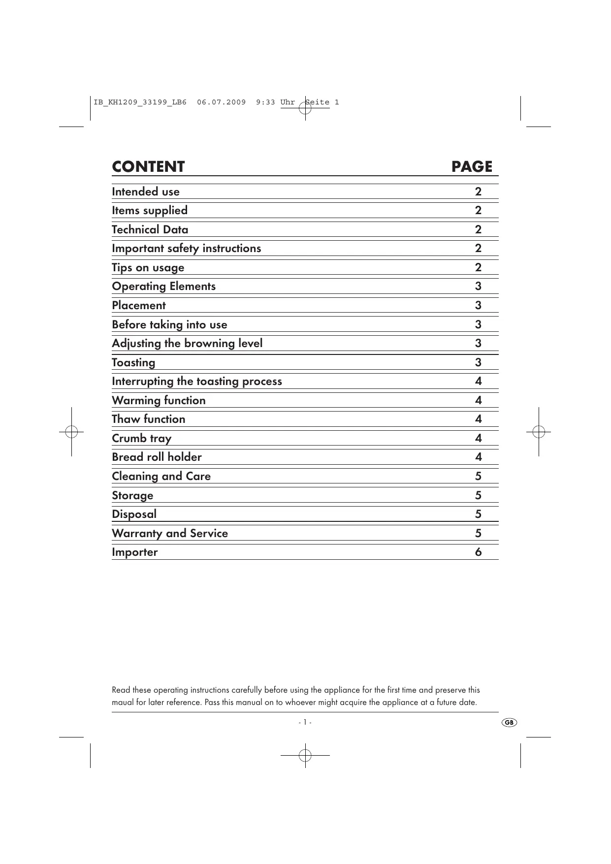 Intended use 2 Items supplied 2 Technical Data 2 Important safety instructions 2 Tips on usage 2 Operating Elements 3 Placement 3 Before taking into use 3 Adjusting the browning level 3 Toasting 3 Interrupting the toasting process 4 Warming function 4 Thaw function 4 h an | Crumb tray 4 | Bread roll holder 4 Cleaning and Care 5 Storage 5 Disposal 5 Warranty and Service 5 Importer 6