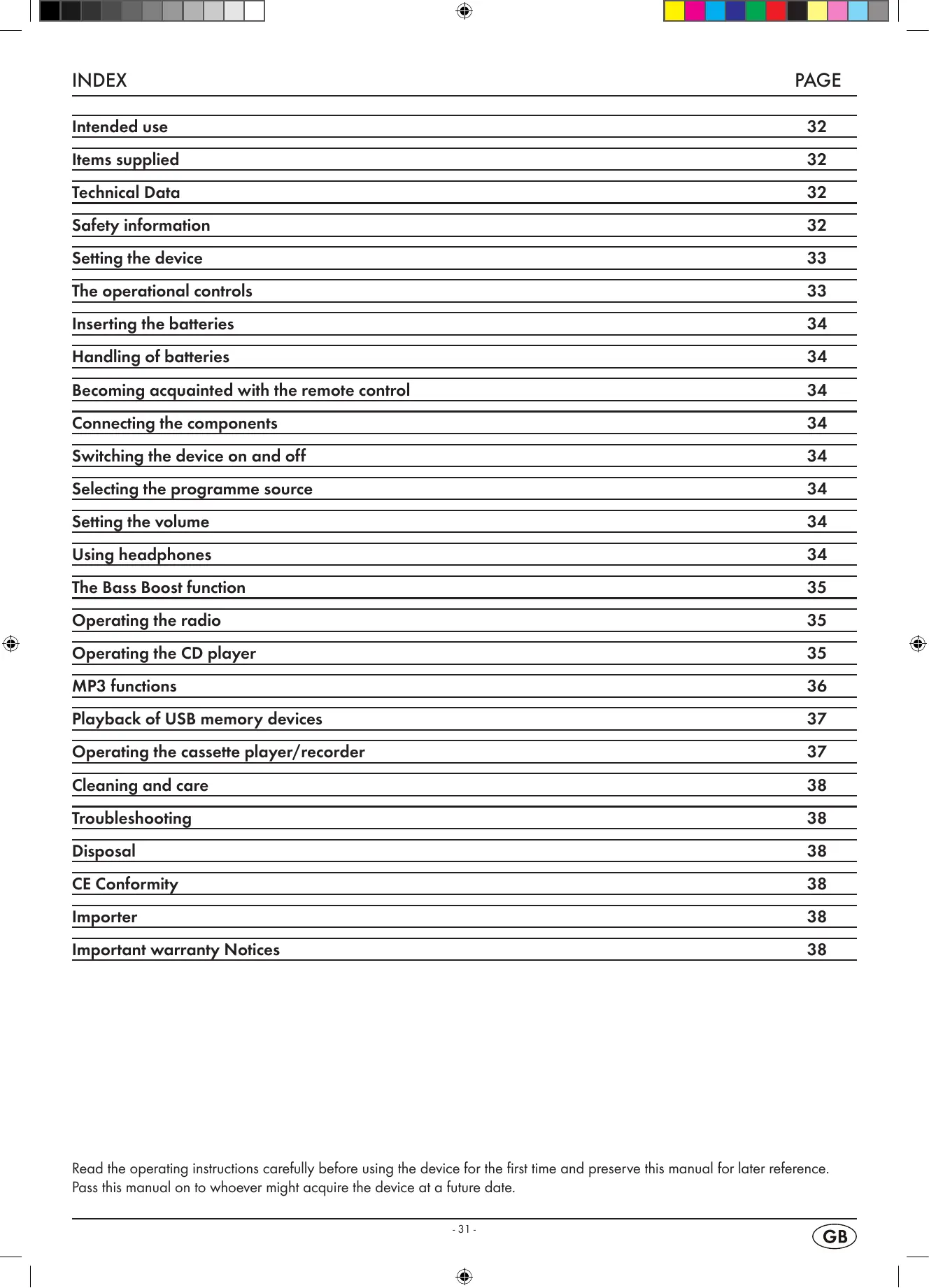 INDEX PAGE intended use 32 Items supplied 32 Technical Data 32 Safety information 32 Setting the device 33 The operational controls 33 Inserting the batteries 34 Handling of batteries 34 Becoming acquainted with the remote control 34 Connecting the components 34 Switching the device on and off 34 Selecting the programme source 34 Setting the volume 34 Using headphones 34 The Bass Boost function 35 Operating the radio 35 Operating the CD player 35 MP3 functions 36 Playback of USB memory devices 37 Operating the cassette player/recorder 37 Cleaning and care 38 Troubleshooting 38 Disposal 38 CE Conformity 38 Importer 38 Important warranty Notices 38