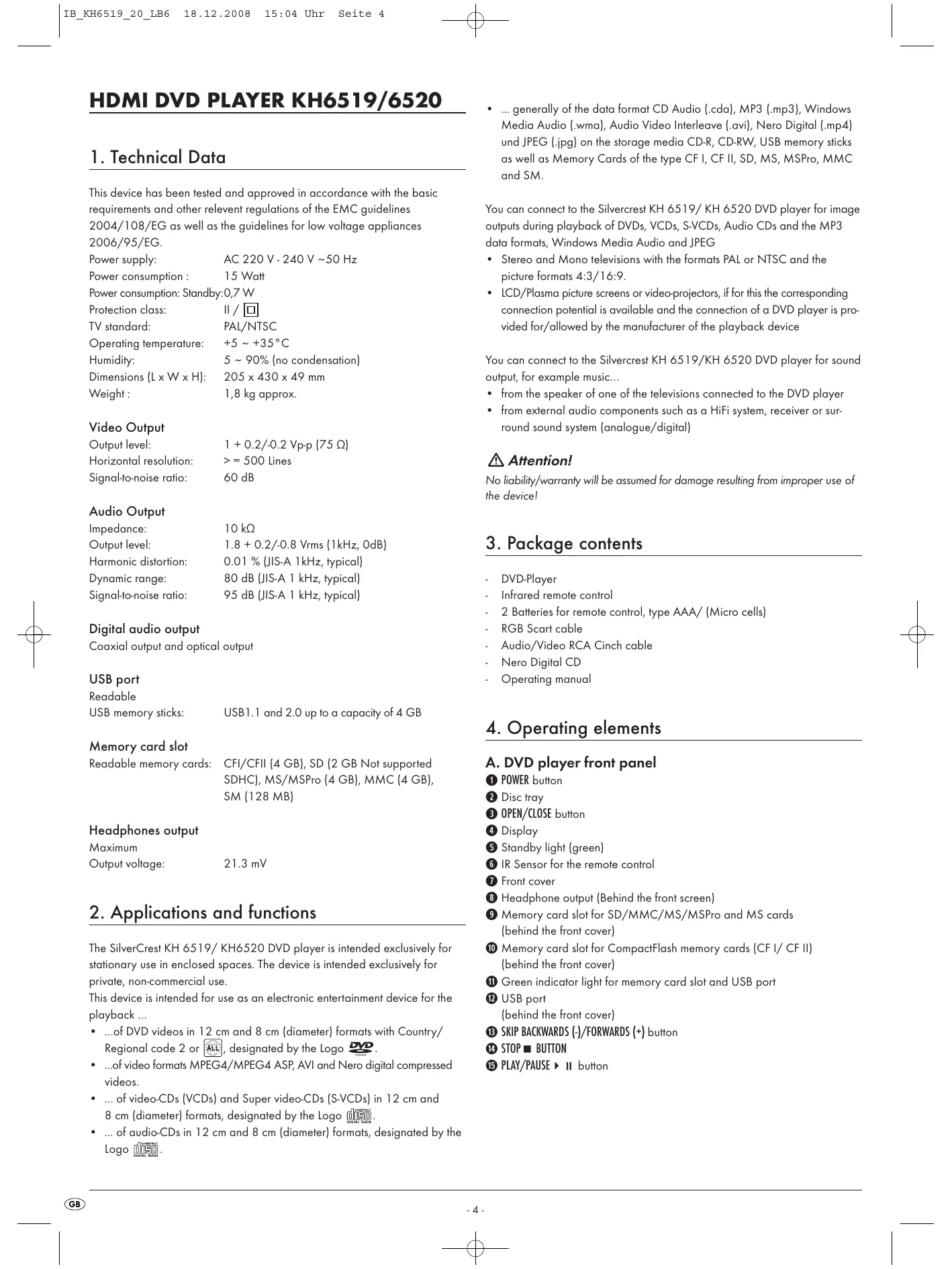 The SilverCrest KH 6519/ KH6520 DVD player is intended exclusively for stationary use in enclosed spaces. The device is intended exclusively for private, non-commercial use. This device is intended for use as an electronic entertainment device for the playback … + of DVD videos in and 8 cm (diameter) formats with Country/ Regional code 2 or designated by the Logo 22. +_.…of video formats MPEG4/MPEGA4 ASP, AVI and Nero digital compressed videos. +. of video-CDs (VCD) and Super video-CDs {S-VCI 8 cm (diameter) formats, designated by the Logo [ in 12 cm and + of audio-CDs in 12 cm and 8 cm [diameter] formats, designated by the Logo