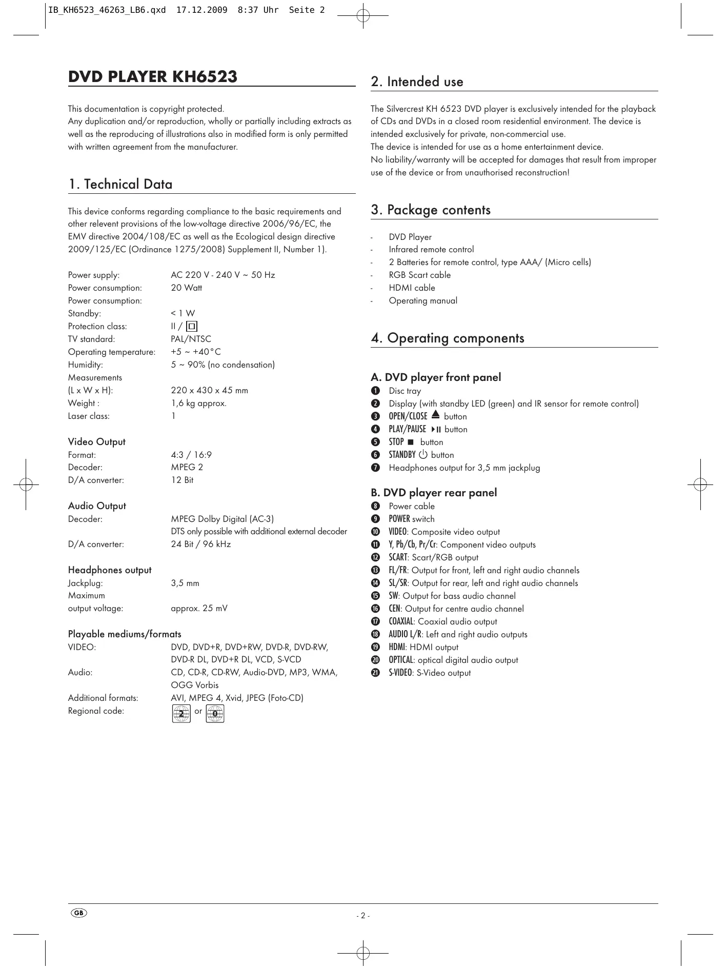 This documentation is copyright protected. Any duplication and/or reproduction, wholly or partially including extracts as The Silvercrest KH 6523 DVD player is exclusively intended for the playback of CDs and DVDs in a closed room residential environment. The device is well as the reproducing of illustrations also in modified form is only permited intended exclusively for private, non-commercial use. With written agreement from the manufacturer. The device is intended for use as a home entertainment device. No liability/warranty will be accepted for damages that result from improper use of the device or from unauthorised reconstruction!