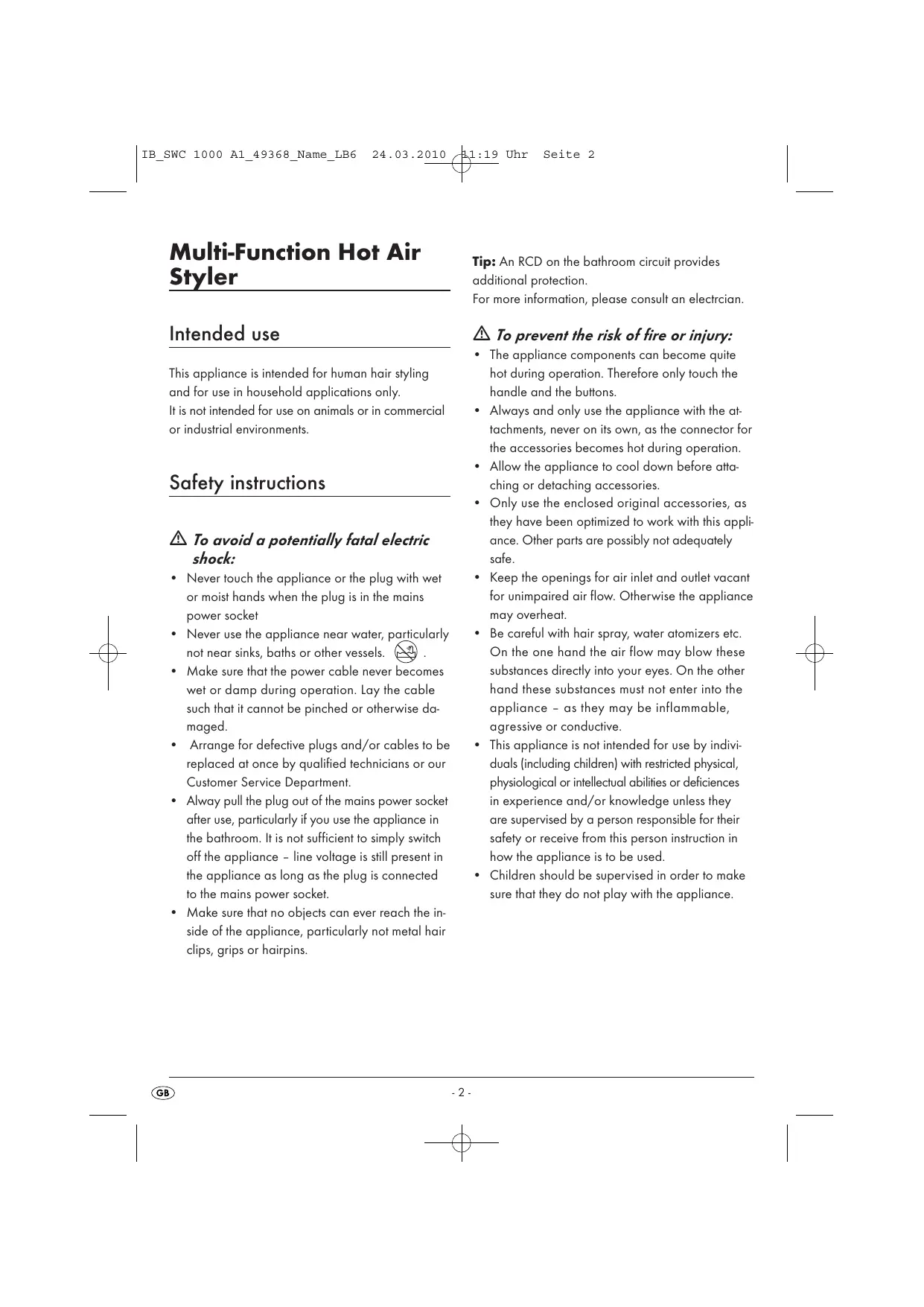IB_SWC 1000 A1 49368 Name LB6 24.03.2010 & 9 Uhr Seite 2 Multi-Function Hot Air Styler Intended use This appliance is intended for human hair styling and for use in household applications only. His not intended for use on animals or in commercial or industrial environments. Safety instructions À To avoid a potentially fatal electric shock: + Never touch the appliance or the plug with wet or moist hands when the plug is in the mains power socket + Never use the appliance near water, particularly not near sinks, baths or other vessels. + Make sure that the power cable never becomes wet or damp during operation. Lay the cable such that it cannot be pinched or otherwise da- maged. + Arrange for defective plugs and/or cables to be replaced at once by qualiied technicians or our Customer Service Department. + Alway pull the plug out ofthe mains power socket after use, particularly if you use the appliance in the bathroom. lt is not sufficient to simply switch offthe appliance - line voltage is still present in the appliance as long as the plug is connected to the mains power socket. + Make sure that no objects can ever reach the in- side of the appliance, particularly not metal hair clips, grips or haïrpins. Tip: An RCD on the bathroom circuit provides additional protection. For more information, please consult an electrcian. À To prevent the risk of fire or injury: + _ The appliance components can become quite hot during operation. Therefore only touch the handle and the buttons. + Always and only use the appliance with the at- tachments, never on its own, as the connector for the accessories becomes hot during operation. + Allow the appliance to cool down before atta- ching or detaching accessories. + Only use the enclosed original accessories, as they have been optimized to work with this appli- ance. Other paris are possibly not adequately safe. +_ Keep the openings for air inlet and outlet vacant for unimpaired air flow. Otherwise the appliance may overheat. +_ Be careful with hair spray, water atomizers etc. On the one hand the air flow may blow these substances directly into your eyes. On the other hand these substances must not enter into the appliance - as they may be inflammable, agressive or conductive. + This appliance is not intended for use by indivi- duals [including children] with restricted physical, physiological or intellectual abilifies or deficiences in experience and/or knowledge unless they are supervised by a person responsible for their safety or receive from this person instruction in how the appliance is to be used. +. Children should be supervised in order to make sure that they do not play with the appliance.