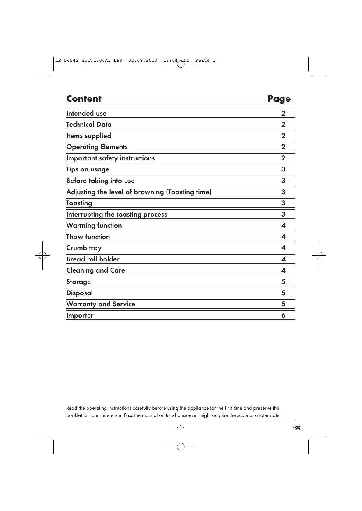 Content Page Intended use 2 Technical Data 2 Items supplied 2 Operating Elements 2 Important safety instructions 2 Tips on usage 3 Before taking into use 3 Adjusting the level of browning (Toasting time) 3 Toasting 3 Interrupting the toasting process 3 Warming function A Thaw function 4 À Crumb tray A / se Bread roll holder 4 7 Cleaning and Care A Storage 5 Disposal 5 Warranty and Service 5 Importer Q Read the operating instructions carefully before using the appliance for the first time and preserve this booklet for later reference. Pass the manual on to whomsoever might acquire the scale at a later date: ne æ