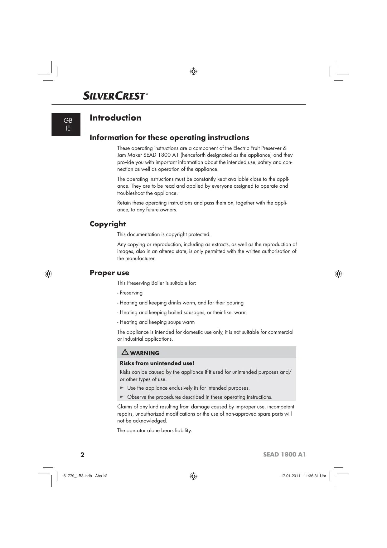 Information for these operating instructions These operating instructions are a component of the Electric Fruit Preserver & Jam Maker SEAD 1800 A1 [henceforth designated as the appliance) and they provide you with important information about the intended use, safety and con- nection as well as operation of the appliance. The operating instructions must be constanily kept available close to the appli- ance. They are to be read and applied by everyone assigned to operate and troubleshoot the appliance. Retain these operating instructions and pass them on, together with the appli- ance, to any future owners. Copyright Proper n | ovrrousom auste This documentation is copyright protected. Any copying or reproduction, including as extracts, as well as the reproduction of images, also in an altered state, is only permitted with the written authorisation of the manufacturer. use & This Preserving Boiler is suitable for: - Preserving = Heating and keeping drinks warm, and for their pouring - Heating and keeping boiled sausages, or their like, warm - Heating and keeping soups warm The appliance is intended for domestic use only, it is not suitable for commercial or industrial applications. À WARNING Risks from unintended use! Risks can be caused by the appliance if it used for unintended purposes and/ or other types of use. > Use the appliance exclusively its for intended purposes. > Observe the procedures described in these operating instructions. Claims of any kind resulting from damage caused by improper use, incompetent repairs, unauthorized modifications or the use of non-approved spare parts will not be acknowledged. The operator alone bears liability SEAD 1800 A1 vror2on eat uv | En