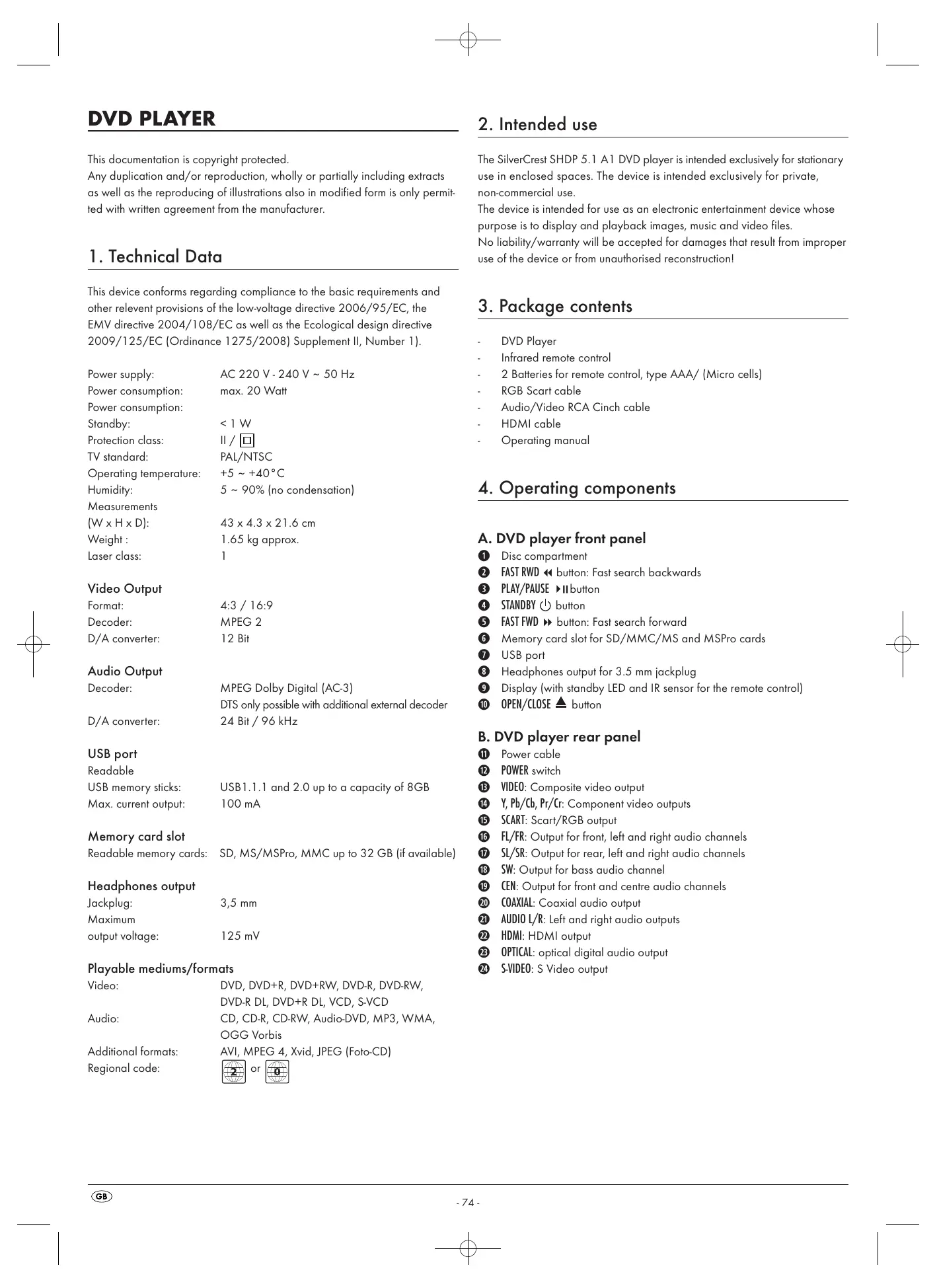 INDEX PAGE 1. Technical Data 74 2. Intended use 74 3. Package contents 74 4. Operating components 74 5. Setting up of the DVD player 75 6. Safety instructions