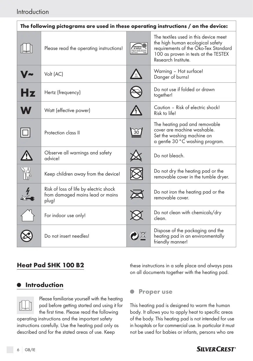 Dispose of the packaging and the heating pad in an environmentally friendly mannerl Heat Pad SHK 100 B2 © Introduction Please familiarise yourself wih the heating pad before getting started and using it for the first time. Please read the following operating instructions and the important safety instructions carefully. Use the heating pad only as described and for the stated areas of use. Keep 6 GB/E these instructions in a safe place and always pass on all documents together with the heating pad. © Proper use This heating pad is designed to warm the human body. lt allows you to apply heat to specific areas ofthe body. This heating pad is not intended for use in hospitals or for commercial use. In particular it must not be used for babies or infants, persons who are SILVER CREST'