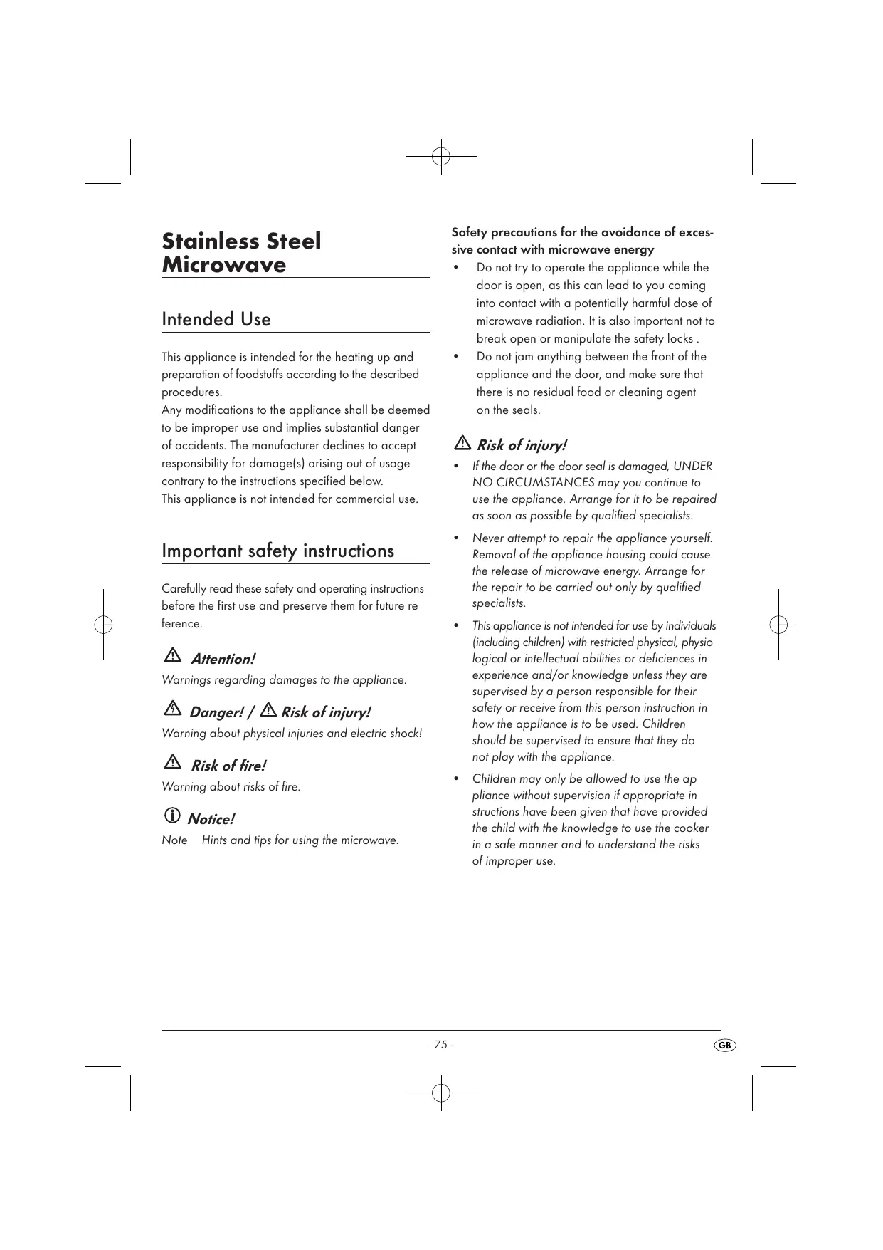 Only use this appliance for its intended purpose as described in this manual. Do not use any caustic chemicals or vapours in this appliance. This micro wave oven is especially designed for the heating, cooking, grillng or drying of foodstuffs