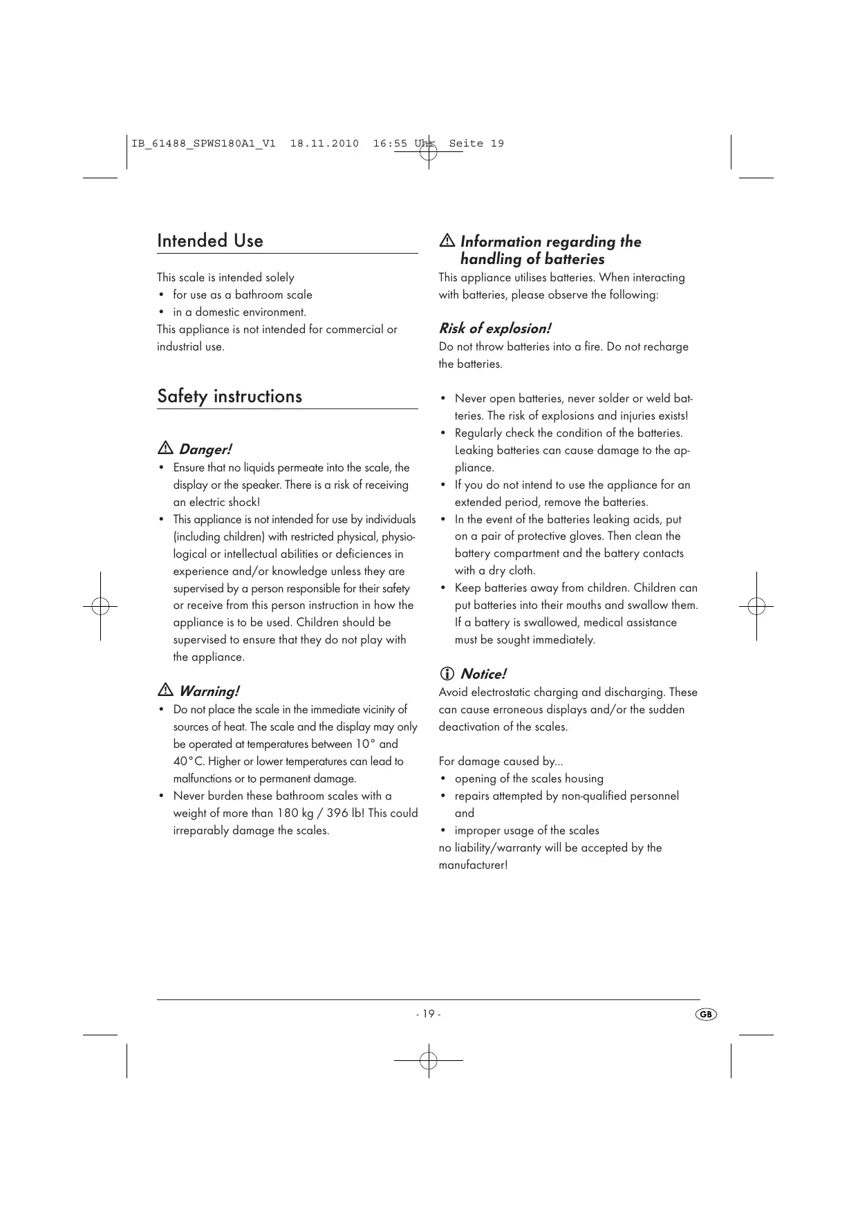 GD Index Page Overview of the appliance 18 Intended Use 19 Safety instructions 19 Technical Data 20 Description of the appliance 20 Items supplied 20 Using the scale 20 Warning indicators 22 Replacing the batteries 22 Usage and safe-keeping 22 Cleaning 22 Troubleshooting 23 À Disposal 23 À | Warranty and Service 24 | Importer 24