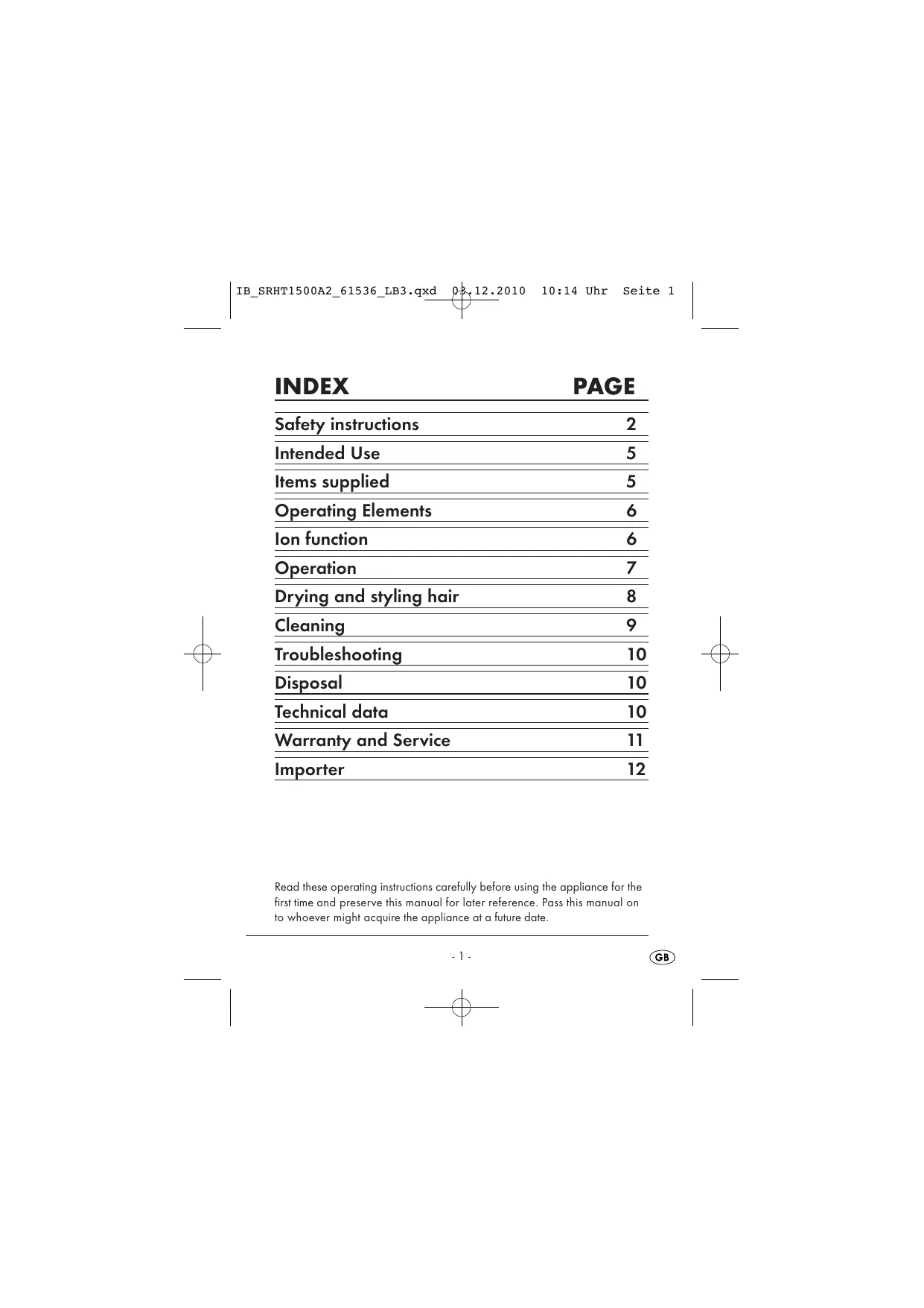 INDEX PAGE Safety instructions 2 intended Use 5 Items supplied 5 Operating Elements 6 lon function Q Operation 7 Drying and styling hair 8 Cleaning 9 Troubleshooting 10 Disposal 10 Technical data 10 Warranty and Service LL Importer 12 Read these operating instructions carefully before using the appliance for the first fime and preserve this manual for later reference. Pass this manual on to whosver might acquire he appliance at a future date ce GD