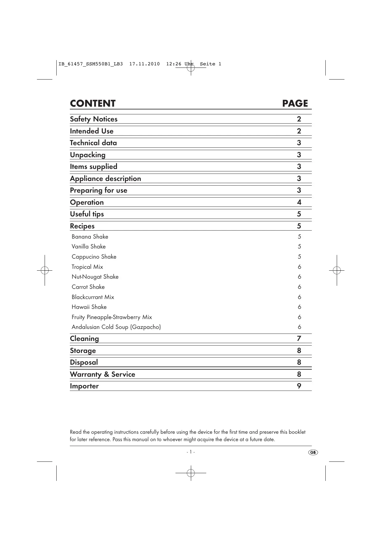 CONTENT PAGE Safety Notices Intended Use Technical data Unpacking Items supplied Appliance description Preparing for use Operation Useful tips Recipes Banana Shake Vanilla Shake Cappucino Shake Tropical Mix Nut-Nougat Shake Carrot Shake Blackeurrant Mix Hawaïi Shake Fruity Pineapple-Strawberry Mix Andalusian Cold Soup (Gazpacho) Cleaning Storage Disposal Warranty & Service O1 0œ1|œ0/10 1!) oo © © oo oœ oœ U üù ul B| www) ww |IN Importer Read the operating instructions carefully before using the device for the first time and preserve this booklet for later reference. Pass this manual on to whoever might acquire the device at a future date.
