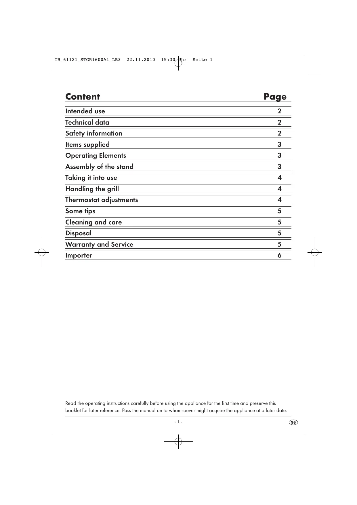 Technical data Safety information Items supplied Operating Elements Assembly of the stand Taking it into use Handling the grill Thermostat adjustments Some tips Cleaning and care Disposal Warranty and Service Importer oœluliulinlinl nn n|wllwllw|| nn Read the operating instructions carefully before using the appliance for the first time and preserve this booklet for later reference. Pass the manual on to whomsoever might acquire the appliance at a later date.