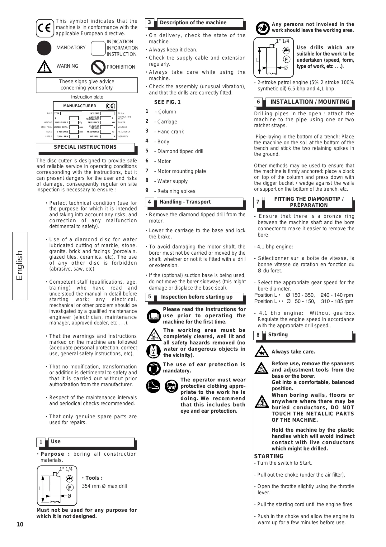 Use drills which are suitable for the work to be undertaken (speed, form, type of work, etc . . .). - 2-stroke petrol engine (5% 2 stroke 100% synthetic oil) 6.5 bhp and 4,1 bhp.