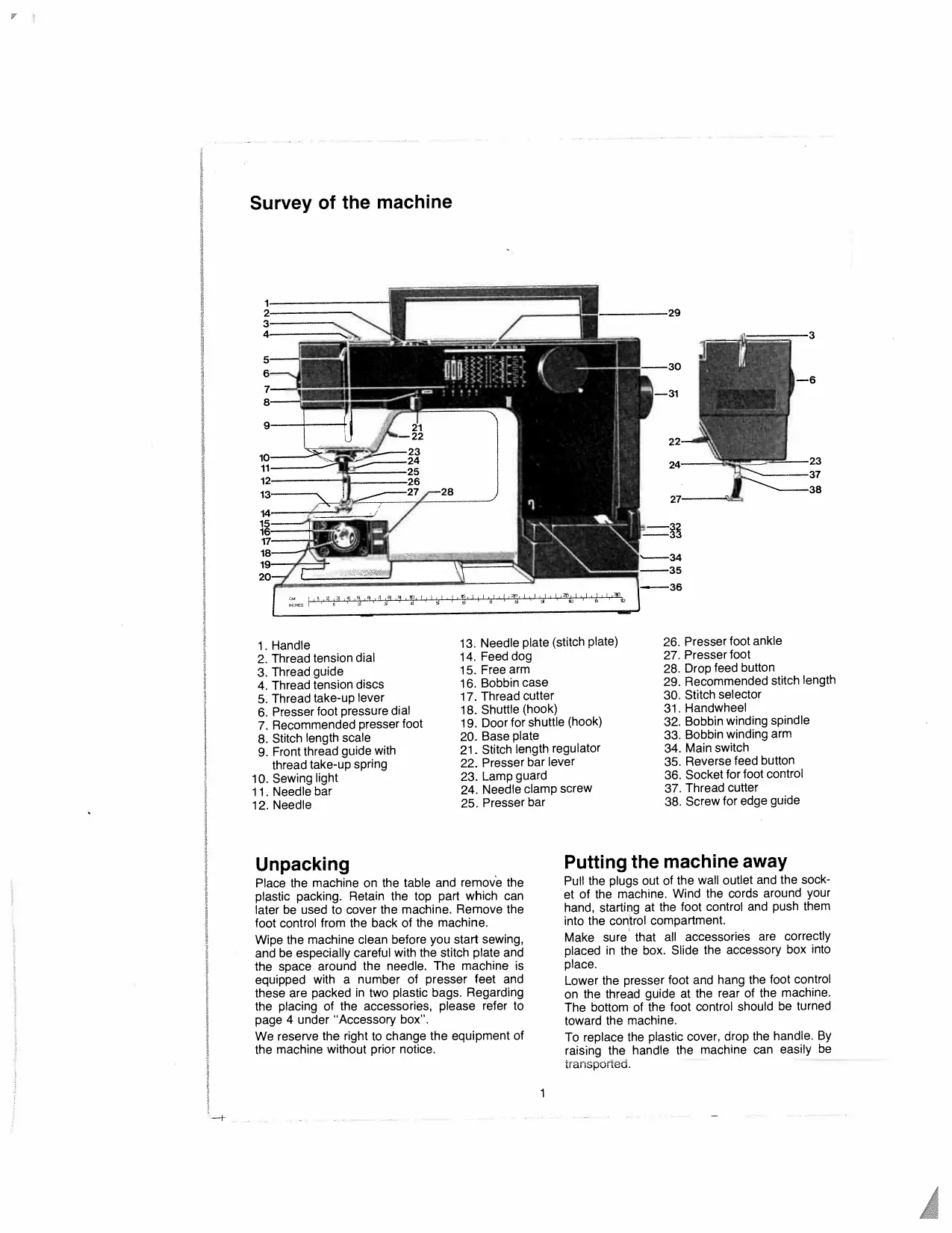 Presser foot ankle Presser foot Drop feed button Recommended stitch length Stitch selector Handwheel Bobbin winding spindle Bobbin winding arm Main switch Reverse feed button Socket for foot control Thread cutter Screw for edge guide Unpacking Putting the machine away Place the machine on the table and remove the plastic packing. Retain the top part which can later be used to cover the machine. Remove the foot control from the back of the machine. Wipe the machine clean before you start sewing, and be especially careful with the stitch plate and the space around the needle. The machine is equipped with a number of presser feet and these are packed in two plastic bags. Regarding the placing of the accessories, please refer to page 4 under ‘Accessory box”. We reserve the right to change the equipment of the machine without prior notice. Pull the plugs out of the wall outlet and the sock et of the machine. Wind the cords around your hand, starting at the foot control and push them into the control compartment. Make sure that all accessories are correctly placed in the box. Slide the accessory box into place. Lower the presser foot and hang the foot control on the thread guide at the rear of the machine. The bottom of the foot control should be turned toward the machine. To replace the plastic cover, drop the handle, By raising the handle the machine can easily be transportea. Connecting the foot control Remove the cord from the foot control and place the control under the table. Insert the foot control plug with the marking ‘UP” upward into the socket on the right-hand side of the machine. Connnecting to the wall outlet The voltage (V) and frequency (Hz) are indicated under the base of the machine. Check that these values corre spond to those of the electricity source before connecting the machine.