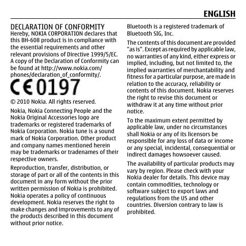 Hereby, NOKIA CORPORATION declares that this BH-608 product is in compliance with the essential requirements and other relevant provisions of Directive 1999/5/EC. A copy of the Declaration of Conformity can be found at http://www.nokia.com/phones/declaration_of_conformity/.
