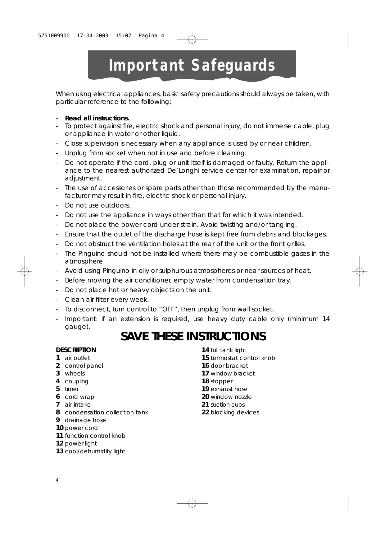 USER MANUAL PINGUINO PAC 10 DELONGHI
