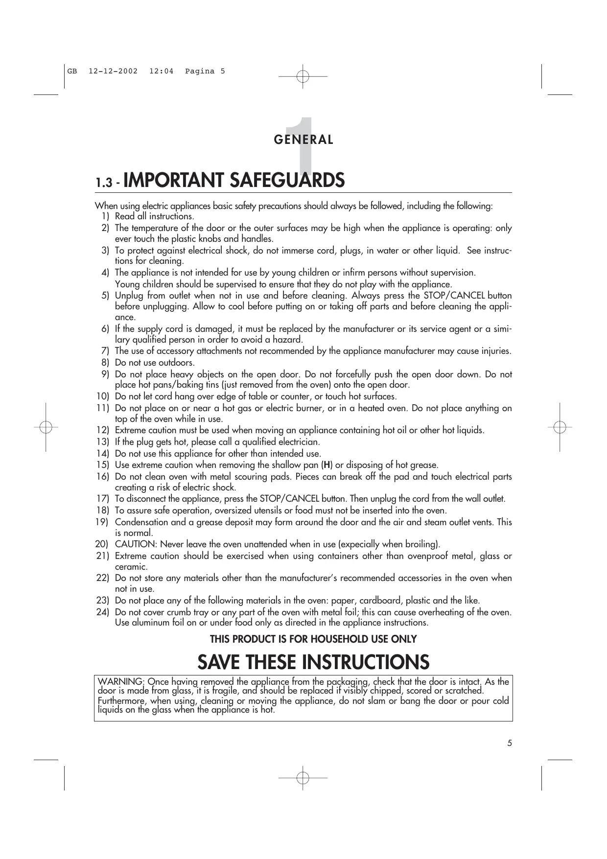 1.3 - IMPORTANT SAFEGUARDS When using electric appliances basic safety precautions should always be followed, including the following: 1} Read all instructions. 2] The temperature of the door or the outer surfaces may be high when the appliance is operating: only ever touch the plastic knobs and handles. 3) To protect against electrical shock, do not immerse cord, plugs, in water or other liquid. See instruc- tions for cleaning. 4] The appliance is not intended for use by young children or infirm persons without supervision. Young children should be supervised to ensure that they do not play with the appliance. Unplug from outlet when not in use and before cleaning. Always press the STOP/CANCEL button belere unplugging. Allow to cool before putting on or taking off parts and before cleaning the appli- ance. 6] 1Fthe supply cord is damaged, it must be replaced by the manufacturer or its service agent or a simi- lary qualified person in order to avoid a hazard. 7] The use of accessory attachments not recommended by the appliance manufacturer may cause injuries. 8) Do not use outdoors. 9] Do not place heavy objects on the open door. Do not forcefully push the open door down. Do not place hot pans/baking tins [just removed from the oven) onto the open door. 10} Do not let cord hang over edge of table or counter, or touch hot surfaces. 11} Do not place on or near a hot gas or electric burner, or in a heated oven. Do not place anything on top of the oven while in use. 12] Extreme caution must be used when moving an appliance containing hot oil or other hot liquids. 13) Ifthe plug gets hot, please call a qualifie electrician. 14) Do not use this appliance for other than intended use. 15) Use extreme caution when removing the shallow pan (H] or disposing of hot grease. 16) Do not clean oven with metal scouring pads. Pieces can break off the pad and touch electrical parts creating a risk of electric shock. 17) To disconnect the appliance, press the STOP/CANCEL button. Then unplug the cord from the wall outlet. 18) To assure safe operation, oversized utensils or food must not be inserted into the oven. 19) Condensaon and a grease deposit may form around the door and the air and steam outlet vents. This is normal. 20) CAUTION: Never leave the oven unaïtended when in use (expecially when broiling). 21) Extreme caution should be exercised when using containers other than ovenproof metal, glass or ceramic. 22] Do not store any materials other than the manufacturer's recommended accessories in the oven when not in use. 23) Do not place any of the following materials in the oven: paper, cardboard, plastic and the like. 24) Do not cover crumb tray or any part of the oven with metal foil; this can cause overheating of the oven. Use aluminum foil on or under food only as directed in the appliance instructions.