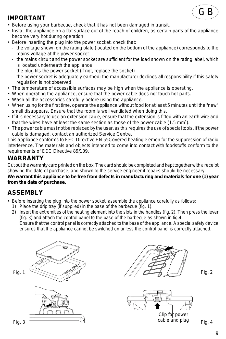 2) Insert the extremities of the heating element into the slots in the handles (fig. 2). Then press the lever (fig. 3) and attach the control panel to the base of the barbecue as shown in fig.4.