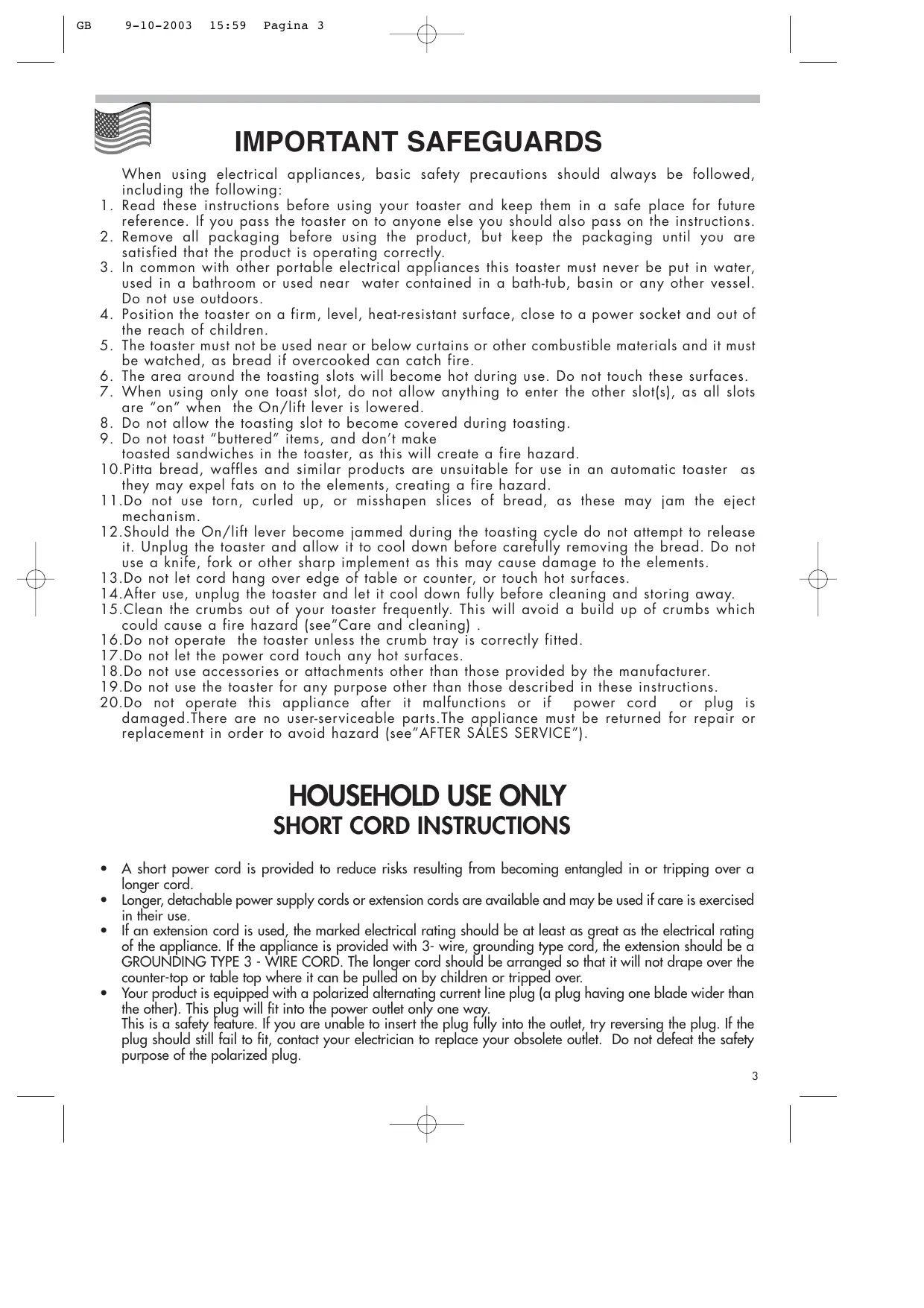 HOUSEHOLD USE ONLY SHORT CORD INSTRUCTIONS