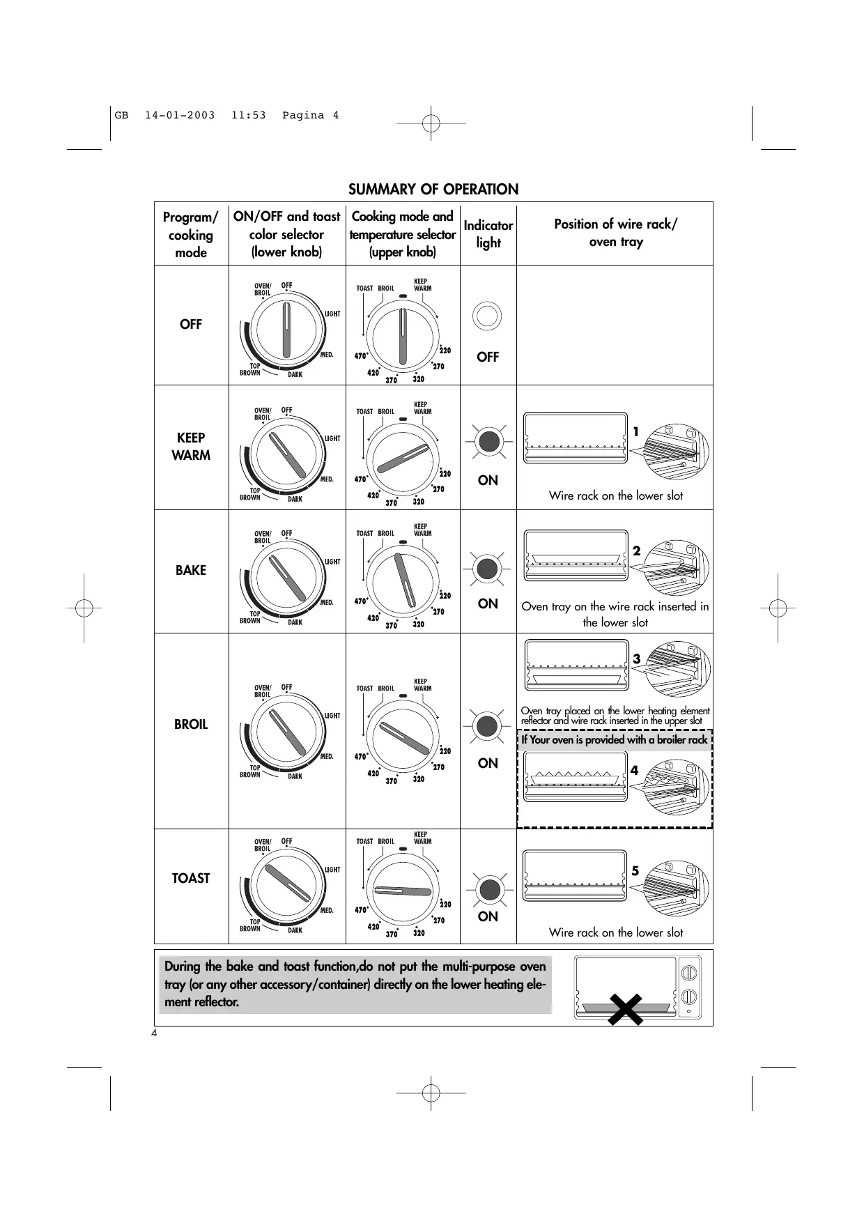 Program/. | ON/OFF and toast | Cooking mode and || | Position of wire rack/ cooking color selector |temperature selector light oven tray mode (lower knob] {upper knob) g ERA Toast mou Wii OFF CA KEEP WARM BAKE Oven tray on the wire rack inserted in the lower slot BROIL Dore TOAST Wire rack on the lower slot During the bake and toast function,do not put the multi-purpose oven f tray (or any other accessory/container) directly on the lower heating ele- d