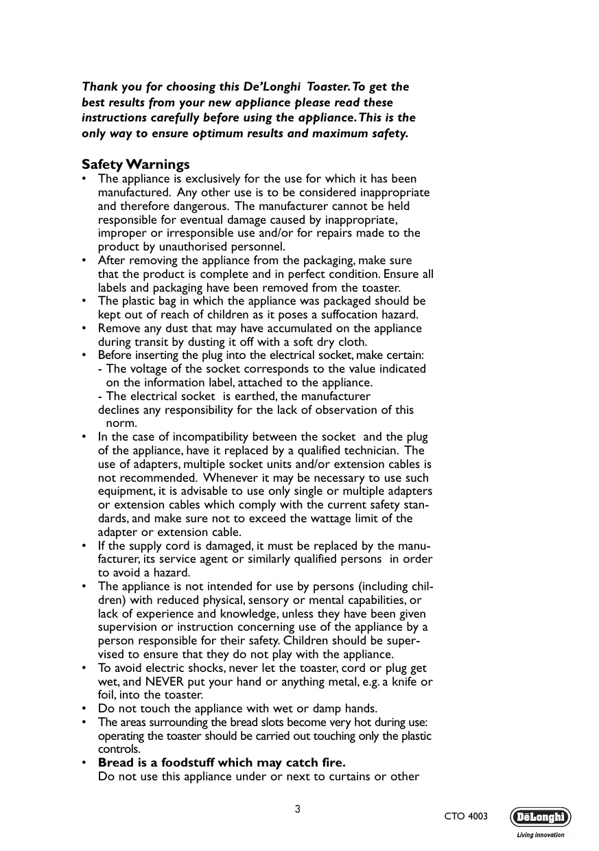 instructions (DeëLonghi TOASTER CTO4003 Please retain these instructions for future reference Living innovation