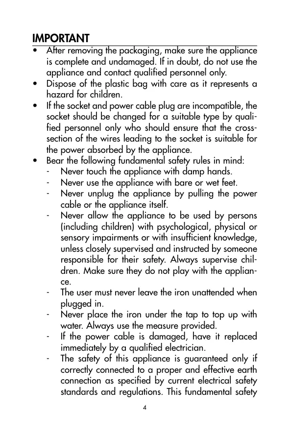 IMPORTANT Affer removing he packaging, make sure the appliance is complete and undamaged. If in doubt, do not use the appliance and contact qualified personnel only. + Dispose of the plastic bag with care as it represents a hazard for children. + IFthe socket and power cable plug are incompatible, the socket should be changed for a suitable type by quai: fied personnel only who should ensure that the cross- section of the wires leading to the socket is suitable for the power absorbed by the appliance. + _ Bear the following fundamental safety rules in mind: = Never touch the appliance with damp hands. - Never use the appliance with bare or wet feet. = Never unplug the appliance by pulling the power cable or the appliance itself. = Never allow the appliance to be used by persons {induding children) with psychological, physical or sensory impairments or with insufficient knowledge, unless closely supervised and instructed by someone responsible for their safety. Always supervise chil- dren. Make sure they do not play with the applian- ce. - The user must never leave the iron unattended when plugged in. - Never place the iron under the tap to top up with water. Always use the measure provided. = IFthe power cable is damaged, have it replaced immediately by a qualified electrician. = The safety of this appliance is guaranteed only if correcily connected to a proper and effective earth connection as specified by current electrical safety standards and regulations. This fundamental safety