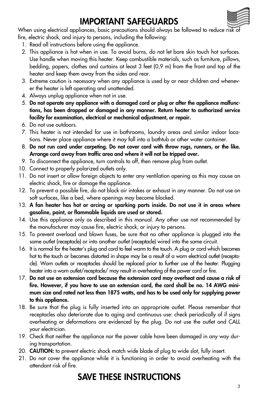 1. Read all instructions before using the appliance. 2. This appliance is hot when in use. To avoid burns, do not let bare skin touch hot surfaces. Use handle when moving this heater. Keep combustible materials, such as furniture, pillows, bedding, papers, clothes and curtains at least 3 feet (0,9 m) from the front and top of the heater and keep them away from the sides and rear. 3. Extreme caution is necessary when any appliance is used by or near children and whenever the heater is left operating and unattended. 4. Always unplug appliance when not in use. 5. Do not operate any appliance with a damaged cord or plug or after the appliance malfunctions, has been dropped or damaged in any manner. Return heater to authorized service facility for examination, electrical or mechanical adjustment, or repair. 6. Do not use outdoors. 7. This heater is not intended for use in bathrooms, laundry areas and similar indoor locations. Never place appliance where it may fall into a bathtub or other water container. 8. Do not run cord under carpeting. Do not cover cord with throw rugs, runners, or the like. Arrange cord away from traffic area and where it will not be tripped over. 9. To disconnect the appliance, turn controls to off, then remove plug from outlet. 10. Connect to properly polarized outlets only. 11. Do not insert or allow foreign objects to enter any ventilation opening as this may cause an electric shock, fire or damage the appliance. 12. To prevent a possible fire, do not block air intakes or exhaust in any manner. Do not use on soft surfaces, like a bed, where openings may become blocked. 13. A fan heater has hot or arcing or sparking parts inside. Do not use it in areas where gasoline, paint, or flammable liquids are used or stored. 14. Use this appliance only as described in this manual. Any other use not recommended by the manufacturer may cause fire, electric shock, or injury to persons. 15. To prevent overload and blown fuses, be sure that no other appliance is plugged into the same outlet (receptacle) or into another outlet (receptacle) wired into the same circuit. 16. It is normal for the heater’s plug and cord to feel warm to the touch. A plug or cord which becomes hot to the touch or becomes distorted in shape may be a result of a worn electrical outlet (receptacle). Worn outlets or receptacles should be replaced prior to further use of the heater. Plugging heater into a worn outlet/receptacle/ may result in overheating of the power cord or fire. 17. Do not use an extension cord because the extension cord may overheat and cause a risk of fire. However, if you have to use an extension cord, the cord shall be no. 14 AWG minimum size and rated not less than 1875 watts, and has to be used only for supplying power to this appliance. 18. Be sure that the plug is fully inserted into an appropriate outlet. Please remember that receptacles also deteriorate due to aging and continuous use: check periodically of if signs overheating or deformations are evidenced by the plug. Do not use the outlet and CALL your electrician. 19. Check that neither the appliance nor the power cable have been damaged in any way during transportation. 20. CAUTION: to prevent electric shock match wide blade of plug to wide slot, fully insert. 21. Do not cover the appliance while it is functioning in order to avoid overheating with the attendant risk of fire.