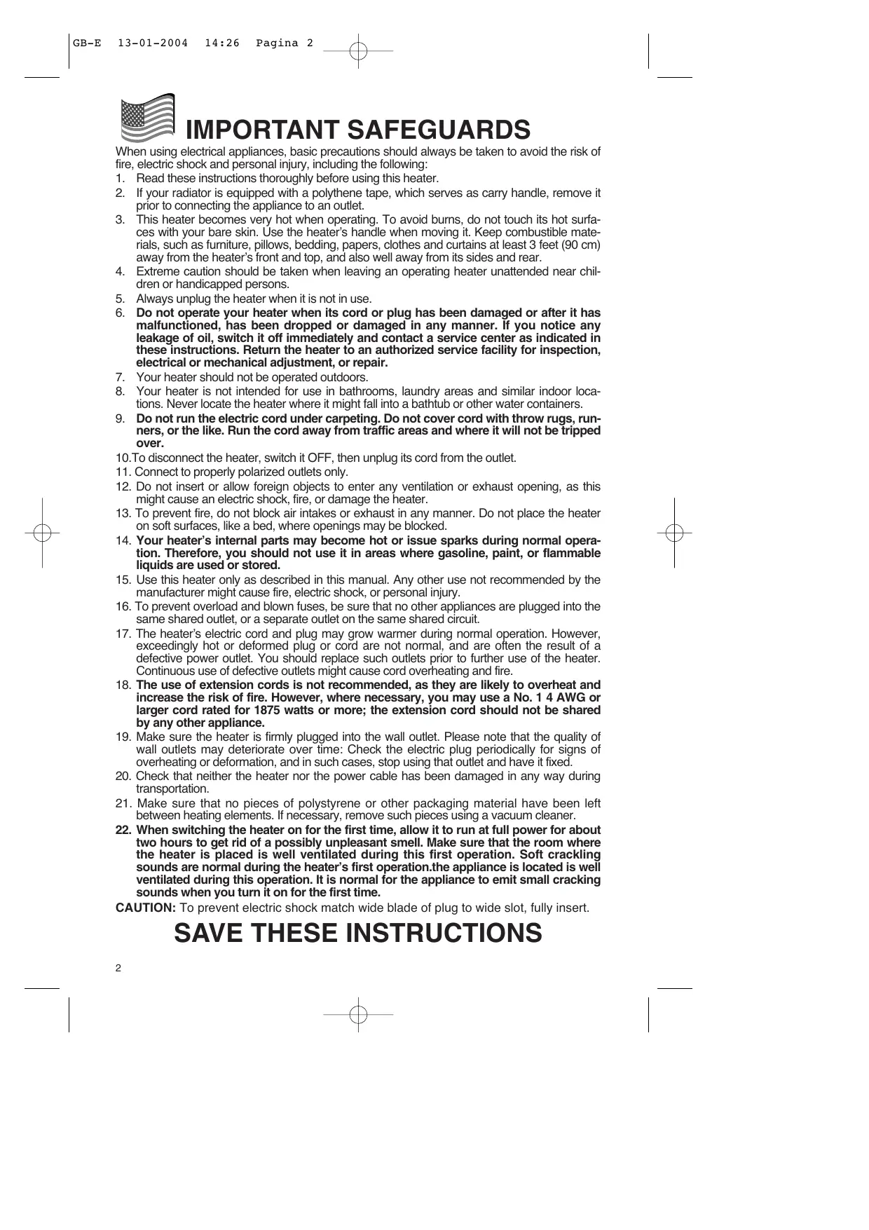 IMPORTANT SAFEGUARDS When using electrical appliances, basic precautions should always be taken to avoid the risk of fire, electric shock and personal injury, including the following: 1. Read these instructions thoroughly before using this heater. 2. If your radiator is equipped with a polythene tape, which serves as carry handle, remove it prior to connecting the appliance to an outlet. 3. This heater becomes very hot when operating. To avoid burns, do not touch its hot surfaces with your bare skin. Use the heater’s handle when moving it. Keep combustible materials, such as furniture, pillows, bedding, papers, clothes and curtains at least 3 feet (90 cm) away from the heater’s front and top, and also well away from its sides and rear. 4. Extreme caution should be taken when leaving an operating heater unattended near children or handicapped persons. 5. Always unplug the heater when it is not in use. 6. Do not operate your heater when its cord or plug has been damaged or after it has malfunctioned, has been dropped or damaged in any manner. If you notice any leakage of oil, switch it off immediately and contact a service center as indicated in these instructions. Return the heater to an authorized service facility for inspection, electrical or mechanical adjustment, or repair. 7. Your heater should not be operated outdoors. 8. Your heater is not intended for use in bathrooms, laundry areas and similar indoor locations. Never locate the heater where it might fall into a bathtub or other water containers. 9. Do not run the electric cord under carpeting. Do not cover cord with throw rugs, runners, or the like. Run the cord away from traffic areas and where it will not be tripped over. 10.To disconnect the heater, switch it OFF, then unplug its cord from the outlet. 11. Connect to properly polarized outlets only. 12. Do not insert or allow foreign objects to enter any ventilation or exhaust opening, as this might cause an electric shock, fire, or damage the heater. 13. To prevent fire, do not block air intakes or exhaust in any manner. Do not place the heater on soft surfaces, like a bed, where openings may be blocked. 14. Your heater’s internal parts may become hot or issue sparks during normal operation. Therefore, you should not use it in areas where gasoline, paint, or flammable liquids are used or stored. 15. Use this heater only as described in this manual. Any other use not recommended by the manufacturer might cause fire, electric shock, or personal injury. 16. To prevent overload and blown fuses, be sure that no other appliances are plugged into the same shared outlet, or a separate outlet on the same shared circuit. 17. The heater’s electric cord and plug may grow warmer during normal operation. However, exceedingly hot or deformed plug or cord are not normal, and are often the result of a defective power outlet. You should replace such outlets prior to further use of the heater. Continuous use of defective outlets might cause cord overheating and fire. 18. The use of extension cords is not recommended, as they are likely to overheat and increase the risk of fire. However, where necessary, you may use a No. 1 4 AWG or larger cord rated for 1875 watts or more; the extension cord should not be shared by any other appliance. 19. Make sure the heater is firmly plugged into the wall outlet. Please note that the quality of wall outlets may deteriorate over time: Check the electric plug periodically for signs of overheating or deformation, and in such cases, stop using that outlet and have it fixed. 20. Check that neither the heater nor the power cable has been damaged in any way during transportation. 21. Make sure that no pieces of polystyrene or other packaging material have been left between heating elements. If necessary, remove such pieces using a vacuum cleaner. 22. When switching the heater on for the first time, allow it to run at full power for about two hours to get rid of a possibly unpleasant smell. Make sure that the room where the heater is placed is well ventilated during this first operation. Soft crackling sounds are normal during the heater’s first operation.the appliance is located is well ventilated during this operation. It is normal for the appliance to emit small cracking sounds when you turn it on for the first time. CAUTION: To prevent electric shock match wide blade of plug to wide slot, fully insert.