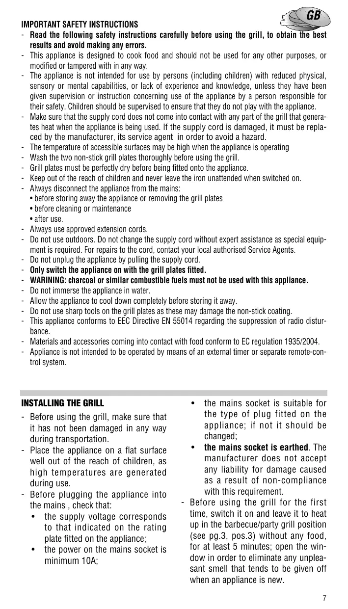 - after use. - Always use approved extension cords. - Do not use outdoors. Do not change the supply cord without expert assistance as special equipment is required. For repairs to the cord, contact your local authorised Service Agents. - Do not unplug the appliance by pulling the supply cord. - Only switch the appliance on with the grill plates fitted. - WARINING: charcoal or similar combustible fuels must not be used with this appliance. - Do not immerse the appliance in water. - Allow the appliance to cool down completely before storing it away. - Do not use sharp tools on the grill plates as these may damage the non-stick coating. - This appliance conforms to EEC Directive EN 55014 regarding the suppression of radio disturbance. - Materials and accessories coming into contact with food conform to EC regulation 1935/2004. - Appliance is not intended to be operated by means of an external timer or separate remote-control system.