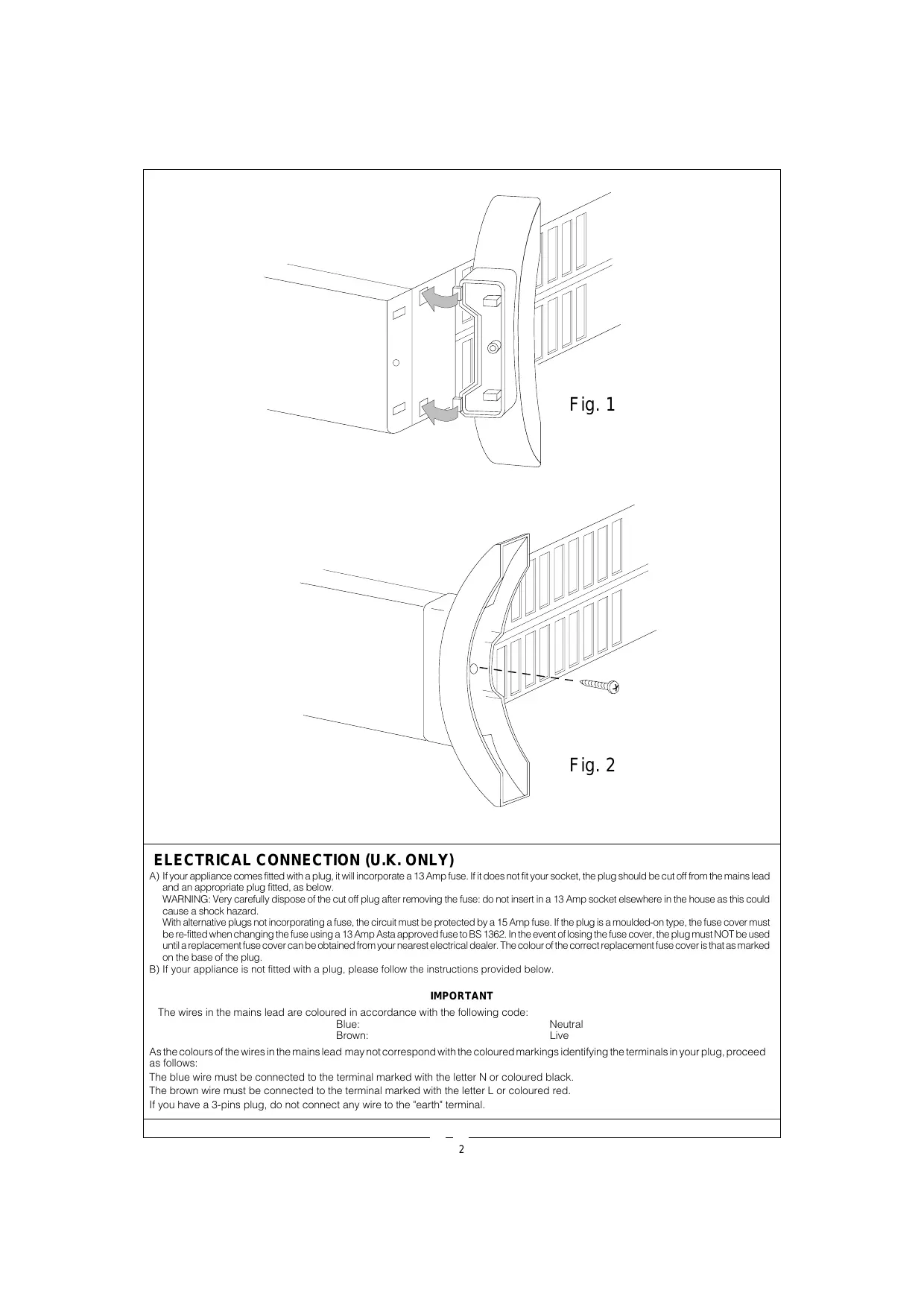 Fig. 1 Fig. 2 ELECTRICAL CONNECTION (U.K. ONLY) A) If your appliance comes fitted with a plug, it will incorporate a 13 Amp fuse. If it does not fit your socket, the plug should be cut off from the mains lead and an appropriate plug fitted, as below. WARNING: Very carefully dispose of the cut off plug after removing the fuse: do not insert in a 13 Amp socket elsewhere in the house as this could cause a shock hazard. With alternative plugs not incorporating a fuse, the circuit must be protected by a 15 Amp fuse. If the plug is a moulded-on type, the fuse cover must be re-fitted when changing the fuse using a 13 Amp Asta approved fuse to BS 1362. In the event of losing the fuse cover, the plug must NOT be used until a replacement fuse cover can be obtained from your nearest electrical dealer. The colour of the correct replacement fuse cover is that as marked on the base of the plug. B) If your appliance is not fitted with a plug, please follow the instructions provided below. IMPORTANT The wires in the mains lead are coloured in accordance with the following code: Blue: Brown: Neutral Live As the colours of the wires in the mains lead may not correspond with the coloured markings identifying the terminals in your plug, proceed as follows: The blue wire must be connected to the terminal marked with the letter N or coloured black. The brown wire must be connected to the terminal marked with the letter L or coloured red. If you have a 3-pins plug, do not connect any wire to the "earth" terminal.