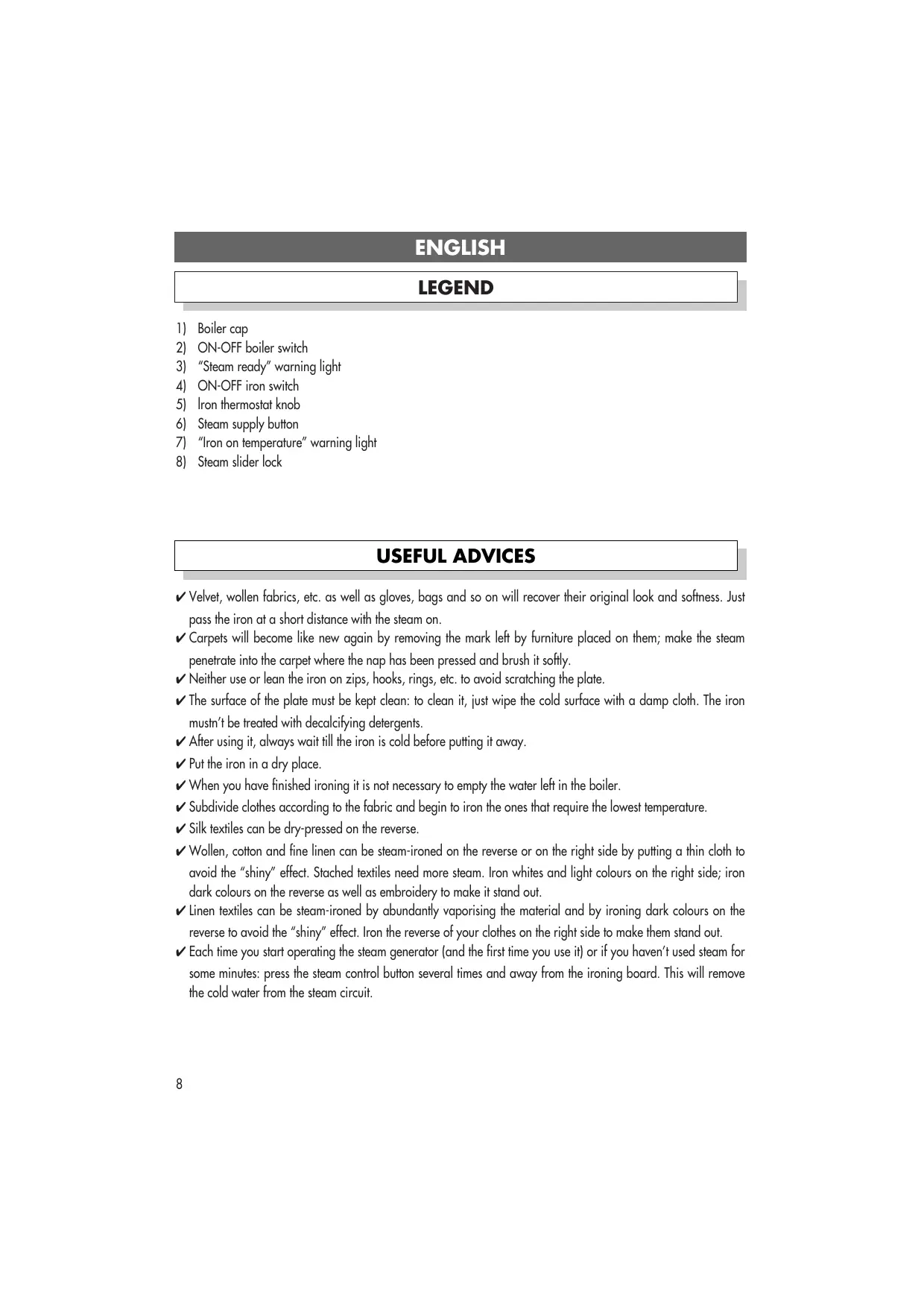 Boiler cap ON-OFF boiler switch “Steam ready” warning light ON-OFF iron switch lron thermostat knob Steam supply button “Iron on temperature” warning light Steam slider lock USEFUL ADVICES ✔ Velvet, wollen fabrics, etc. as well as gloves, bags and so on will recover their original look and softness. Just pass the iron at a short distance with the steam on. ✔ Carpets will become like new again by removing the mark left by furniture placed on them; make the steam penetrate into the carpet where the nap has been pressed and brush it softly. ✔ Neither use or lean the iron on zips, hooks, rings, etc. to avoid scratching the plate. ✔ The surface of the plate must be kept clean: to clean it, just wipe the cold surface with a damp cloth. The iron mustn’t be treated with decalcifying detergents. ✔ After using it, always wait till the iron is cold before putting it away. ✔ Put the iron in a dry place. ✔ When you have finished ironing it is not necessary to empty the water left in the boiler. ✔ Subdivide clothes according to the fabric and begin to iron the ones that require the lowest temperature. ✔ Silk textiles can be dry-pressed on the reverse. ✔ Wollen, cotton and fine linen can be steam-ironed on the reverse or on the right side by putting a thin cloth to avoid the “shiny” effect. Stached textiles need more steam. Iron whites and light colours on the right side; iron dark colours on the reverse as well as embroidery to make it stand out. ✔ Linen textiles can be steam-ironed by abundantly vaporising the material and by ironing dark colours on the reverse to avoid the “shiny” effect. Iron the reverse of your clothes on the right side to make them stand out. ✔ Each time you start operating the steam generator (and the first time you use it) or if you haven’t used steam for some minutes: press the steam control button several times and away from the ironing board. This will remove the cold water from the steam circuit.