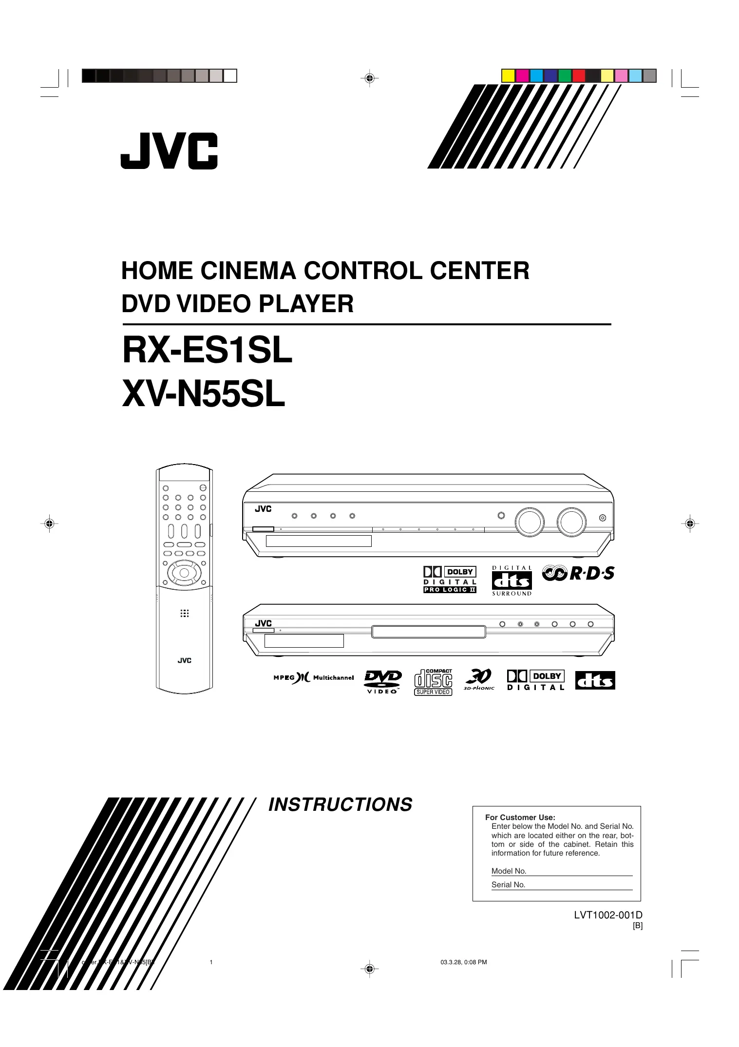 Table of Contents Parts identification Getting started . Precautions … Checking the supplied accessories . Putting batteries in the remote control . Connecting the FM and AM (MW) antennas: Connecting the speakers and DVD player Connecting other video components Connecting the power cord. RX-ES1SL Basic operations 1 Turn on the powel 2 Select the source to play 3 Adjust the volume Selecting the digital decode mode Activating TV Direct … Turning off the sounds temporarily—Muting . Turning off the power with the Sleep Timer Changing the display brighiness Speaker settings … Setting the speakers information automatically —Smart Surround Setup . Setting the speakers and subwoofer information quickly —Quick Setup Setting the speakers and subwoofer information manually —Manual Setup … Basic settings … Operating procedure Setting the digital Input (DIGITAL IN) terminals —DIGITAL IN. Setting Auto Surround—AUTO SR Setting the Auto Function Mode—MODE Sound adjustments Operating procedure Adjusting the tone—BASS, TREBLE Adjusting the subwoofer output level—SUBWFR Adjusting the front speakers output balance—BAL Reinforcing the bass—B.BOOST . Attenuating the input signal—ATT Tuner operations … Tuning in to stations manually Using preset tuning Selecting the FM reception mode . Using the RDS (Radio Data System) to receive FM stations … Searching for a program by PTY code: Switching to broadcast program of your choice temporarily Creating realistic soundfields . Reproducing theater ambience . Introducing the Surround/DSP modes . About relations between speaker layout and Surround/DSP modes Using Surround modes . Using DSP modes Using the DVD MULTI playback mode … Activating the DVD MULTI playback mode . Adjusting the speaker output level . XV-N55SL Before operation About this manual . About discs . Basic operations . Turning on/off the player . Initial setup . Basic playback Resuming playback . Various speed playbac Locating the beginning of a scene or song Advanced operations . Playing from a specific position Changing the playback order Repeat playback … Changing the language, sound and scene angle Special picture/sound effect Menu bar functions . MP3/WMA disc pla yback . Operations JPEG disc pla yback… About JPEG discs . Basic operations Viewing pictures continuously (slide show mode) . Changing the initial settings . Selecting preference Limiting playback by children Additional information … Appendix A: Country/Area code list for Parental Lock Appendix B: Table of languages and their abbreviations Appendix C: Digital output signal chart . Appendix D: Glossary . Operating other JVC products. Operating other manufacturers’ equipment Troubleshooting … Specifications … 082.18, 1:47 PM