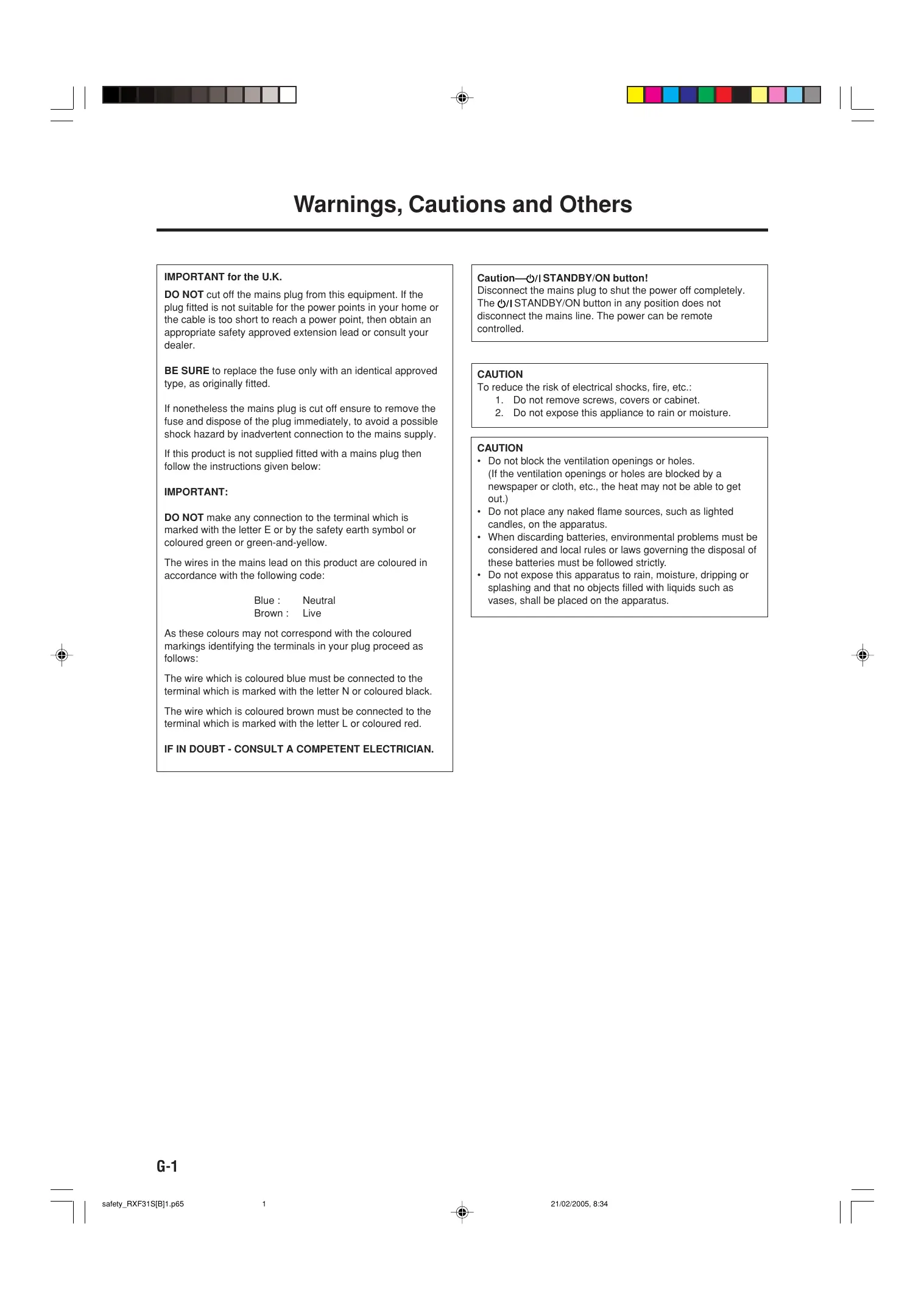 Warnings, Cautions and Others IMPORTANT for the U.K. DO NOT cut off the mains plug from this equipment. If the plug fitted is not suitable for the power points in your home or the cable is too short to reach a power point, then obtain an appropriate safety approved extension lead or consult your dealer. BE SURE to replace the fuse only with an identical approved type, as originally fitted. If nonetheless the mains plug is cut off ensure to remove the fuse and dispose of the plug immediately, to avoid a possible shock hazard by inadvertent connection to the mains supply. If this product is not supplied fitted with a mains plug then follow the instructions given below IMPORTANT: DO NOT make any connection to the terminal which is marked with the letter E or by the safety earth symbol or coloured green or green-and-yellow. The wires in the mains lead on this product are coloured in accordance with the following code: Blue : Neutral Brown: Live As these colours may not correspond with the coloured markings identifying the terminals in your plug proceed as follows The wire which is coloured blue must be connected to the terminal which is marked with the letter N or coloured black. The wire which is coloured brown must be connected to the terminal which is marked with the letter L or coloured red. IF IN DOUBT - CONSULT A COMPETENT ELECTRICIAN. G-1 ”] | safety_RXF31SIB)1.p65 1 Caution—/1STANDBY/ON button! Disconnect the mains plug to shut the power off completely. The @/1 STANDBY/ON button in any position does not disconnect the mains line. The power can be remote controlled. CAUTION To reduce the risk of electrical shocks, fire, etc.