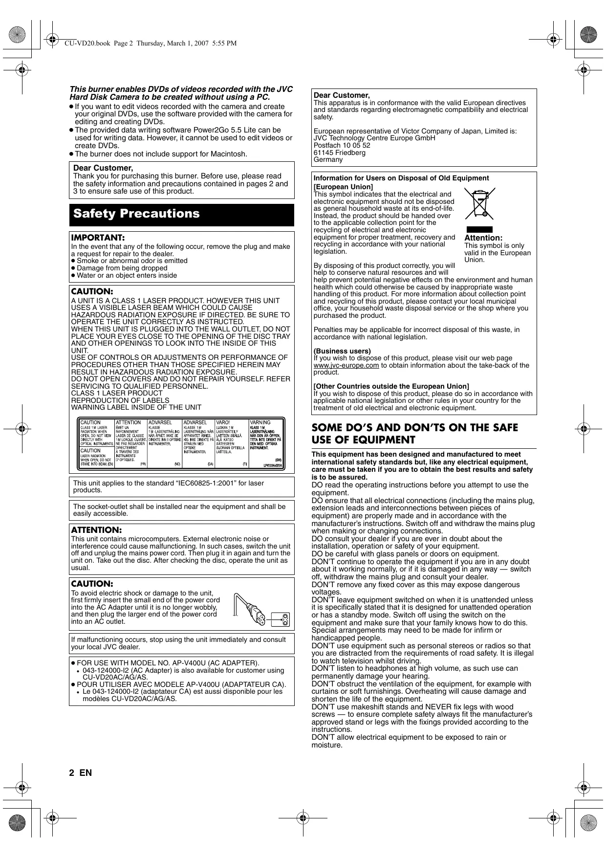 E/EK/ER/AA/AC/AG/AS/TW CU-VD20.book Page 2 Thursday, March 1, 2007 5:55 PM This burner enables DVDs of videos recorded with the JVC Hard Disk Camera to be created without using a PC.