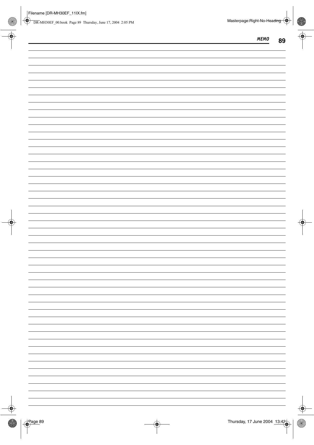 Vérification des programmes ...................................... 49 Thursday, 17 June 2004 13:42 Filename [DR-MH30EF_11IX.fm] DR-MH30EF_00.book Page 89 Thursday, June 17, 2004 2:05 PM Masterpage:Right-No-Heading MEMO Page 89