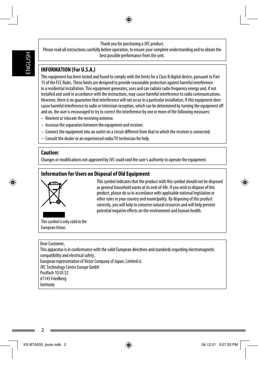 English: Hereby, JVC, declares that this KS-BTA200 is in compliance with the essential requirements and other relevant provisions of Directive 1999/5/EC.