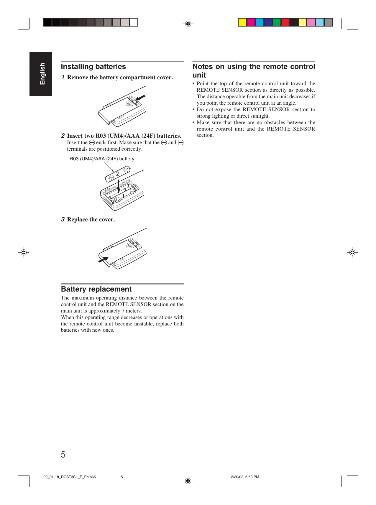 2/20/03, 6:50 PM English Installing batteries 1 Remove the battery compartment cover. Notes on using the remote control unit 2 Insert two R03 (UM4)/AAA (24F) batteries.