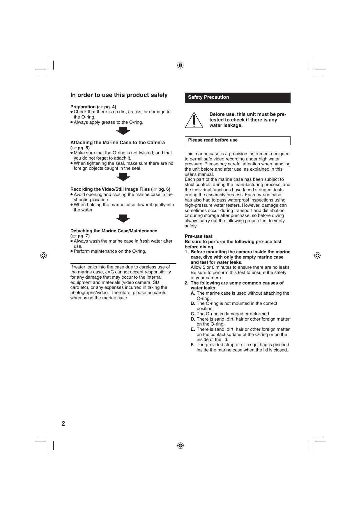 if water leaks into the case due to careless use of the marine case, JVC cannot accept responsibility for any damage that may occur to the internal equipment and materials (video camera, SD